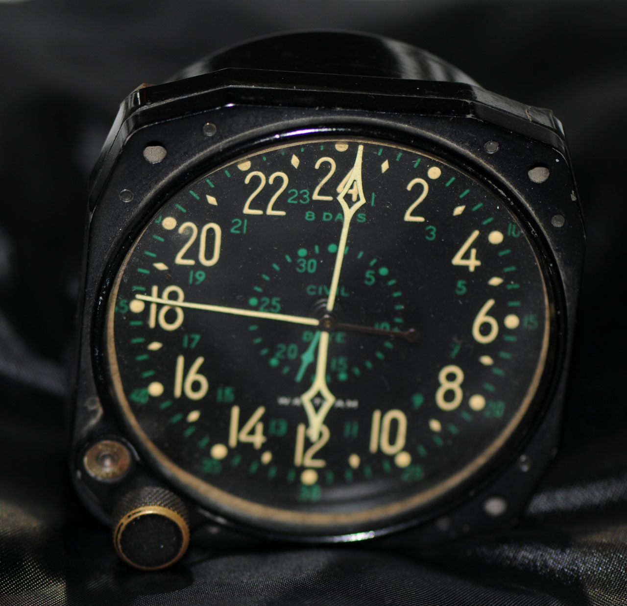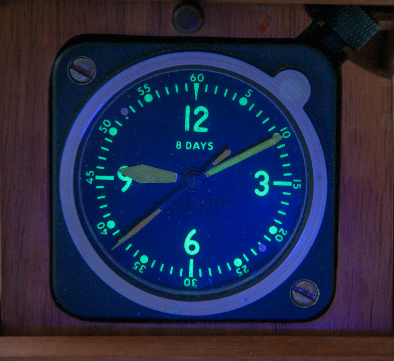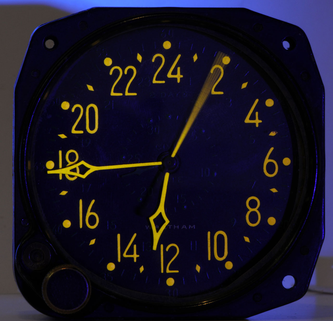 that these clocks have "glow in the dark" marking. That's to say the hands and numbers will glow in the dark after being exposed to white light. They were not designed with "glow in the dark" capabilities, rather they were designed to be used with UV cockpit lights. That way the pilot can read the instruments at night without having his night vision diminished. |