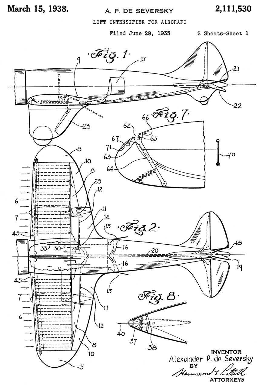 The book (Wiki) Victory Through Air Power (Ref 138) was written a few months after Pearl Harbor (7 Dec 1941) and came out in 1942. At that time high altitude bombers were the ultimate weapon since RADAR was then highly classified. There was no way to detect them and no way to bring them down. In the book Seversky points out the air power was a major factor in pretty much all the battles up to the time the book was written. Aircraft sank eight battleships (Wiki) Pearl Harbor, 10 Dec 1941 Japan sank the HMS Prince of Wales and HMS Repulse (Wiki). Essentially, the Army and Navy are no longer relevant in the age of air power. Yet the Navy was operating battleships up until the end of W.W.II. The book mentions a heavy bomber by Glenn Martin, but the following patent is post W.W.II.