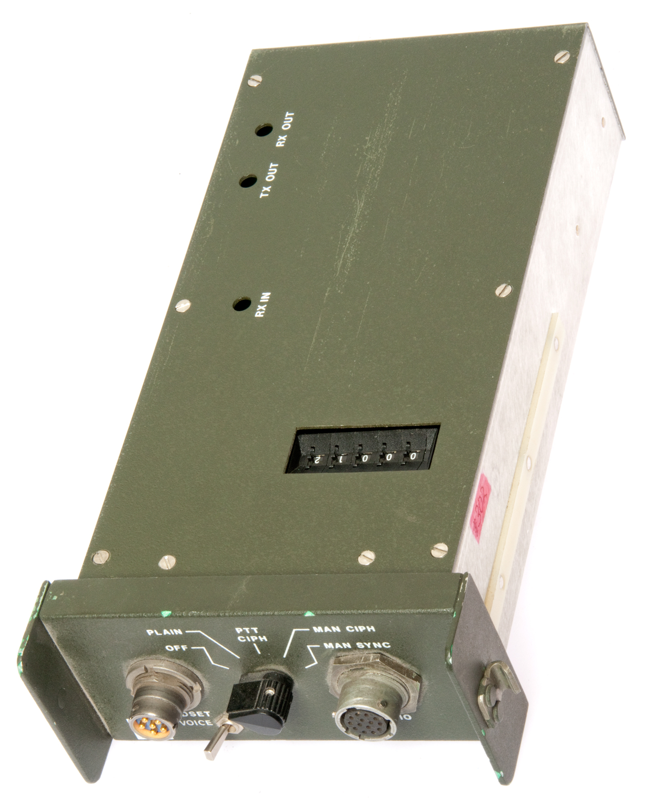 This Communications Security Device is intended for use with either voice or data by selecting which one using a front panel switch. It does not have a FILL port, but instead uses 5 thumbwheel switches to set a code that must be set the same on all devices in a network.