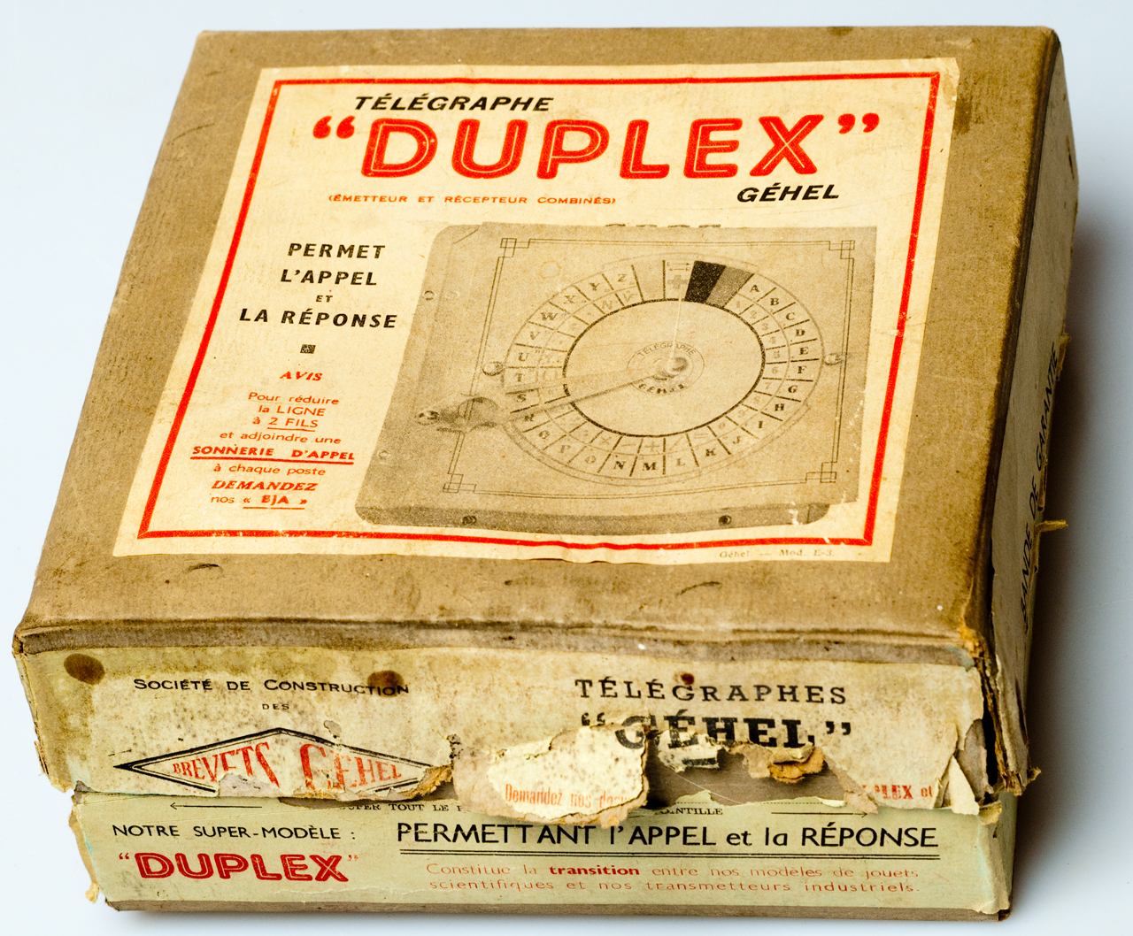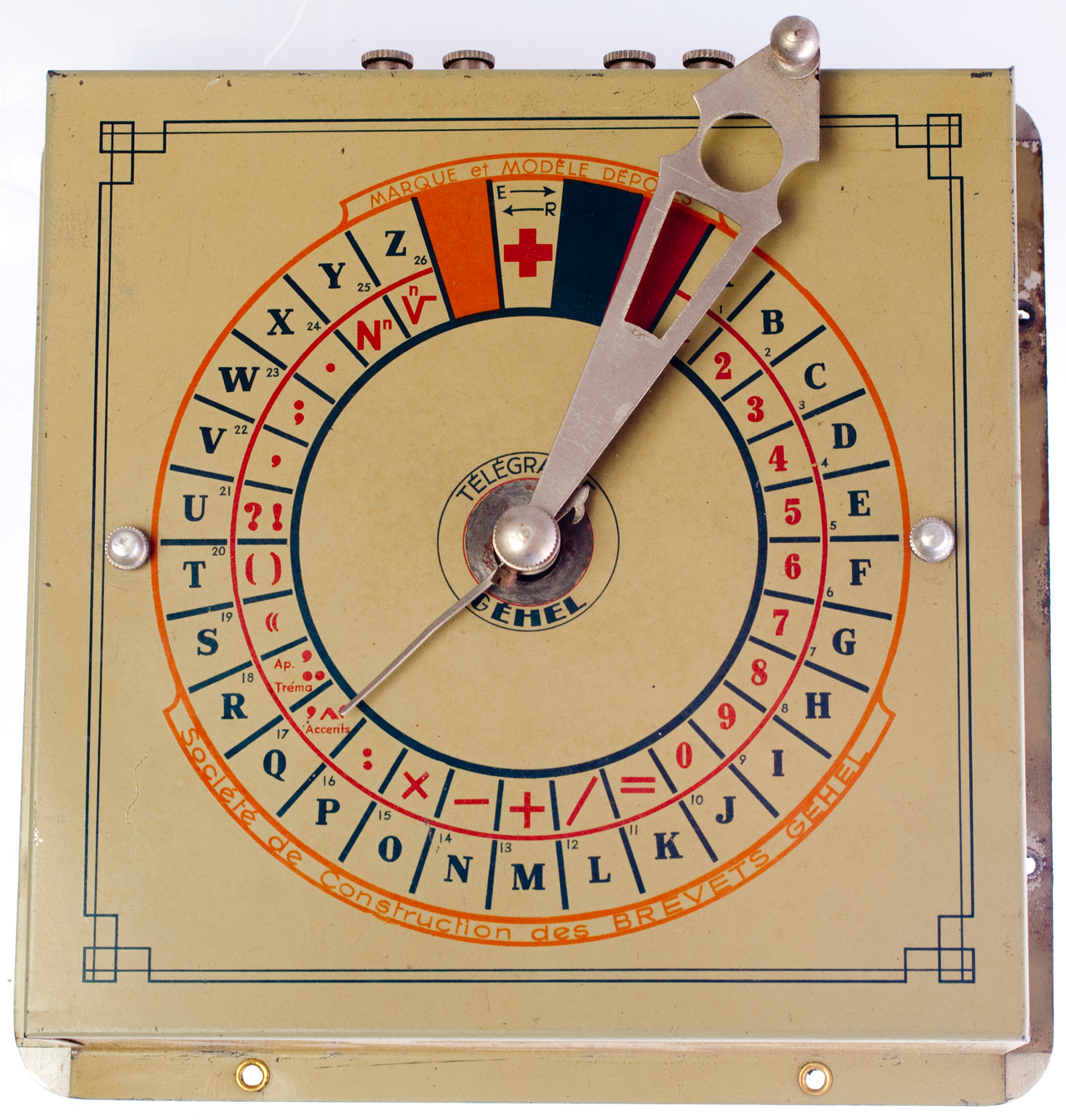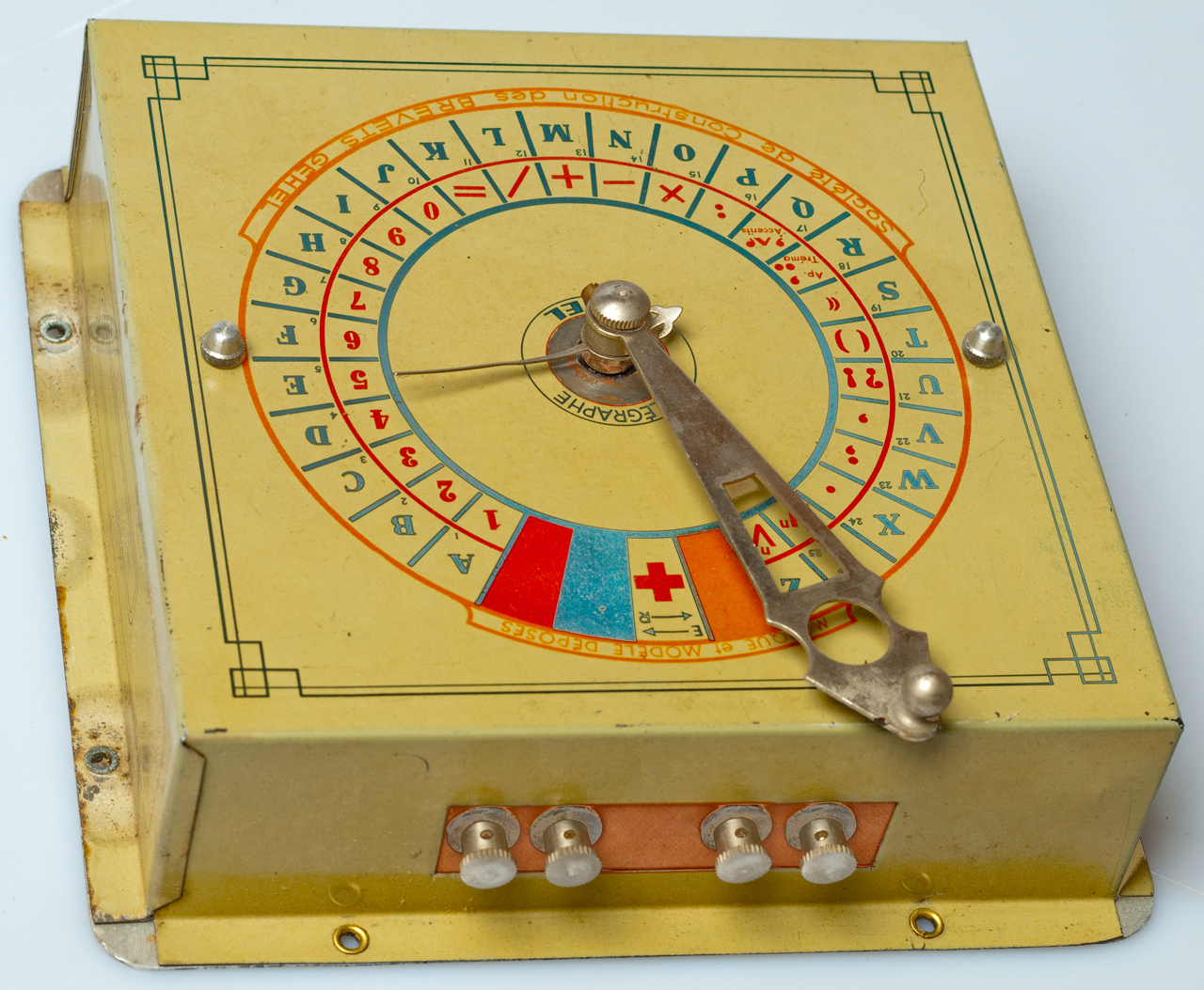 telegraph by Bénévolo (France). In that toy the pointer does point to the letter. This one could have been made to work, but you can tell it's just a 3 position version by the two brads to limit the pointer position. ![]() |