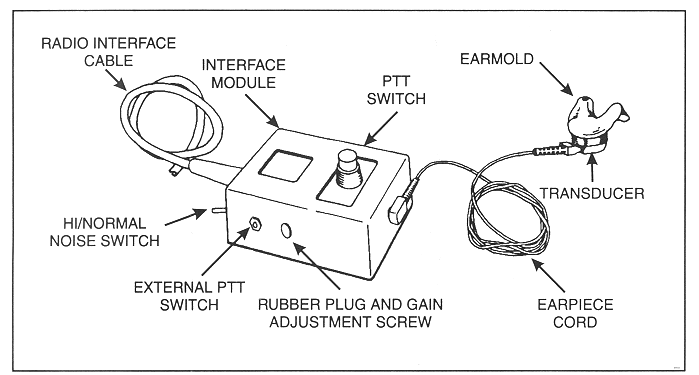 The Ear-Mike Transducer System consists of the transducer, an earpiece cord, an earmold, and an interface module (see illustration). A separate radio interface cable connects the Ear-Mike Transducer System to the radio. (Cables are available to interface the Ear-Mike Transducer System to a wide variety of radios.) The transducer snaps onto the earmold which is then inserted into the ear. The earpiece cord plugs into the transducer and the side of the interface module.