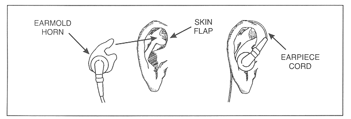 2. Insert the earmold into the ear using a gentle twisting motion. Make sure that the horn (pointed part) of the earmold is behind the skin flap at the front of the ear. Run the earpiece cord up over the ear and down behind. The ear now becomes your cord restraint.