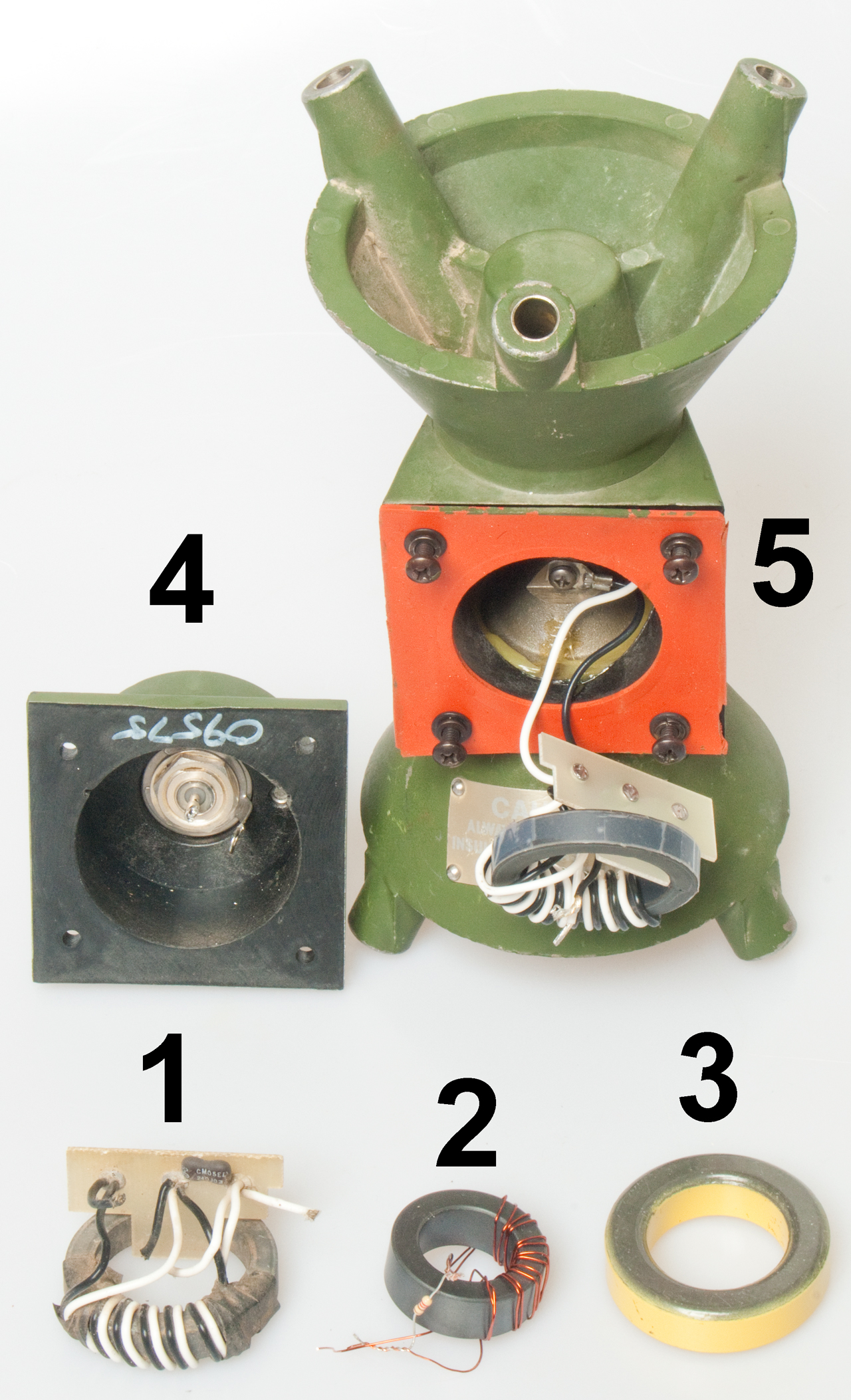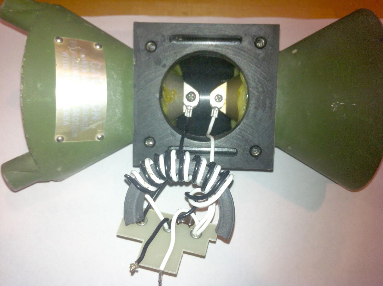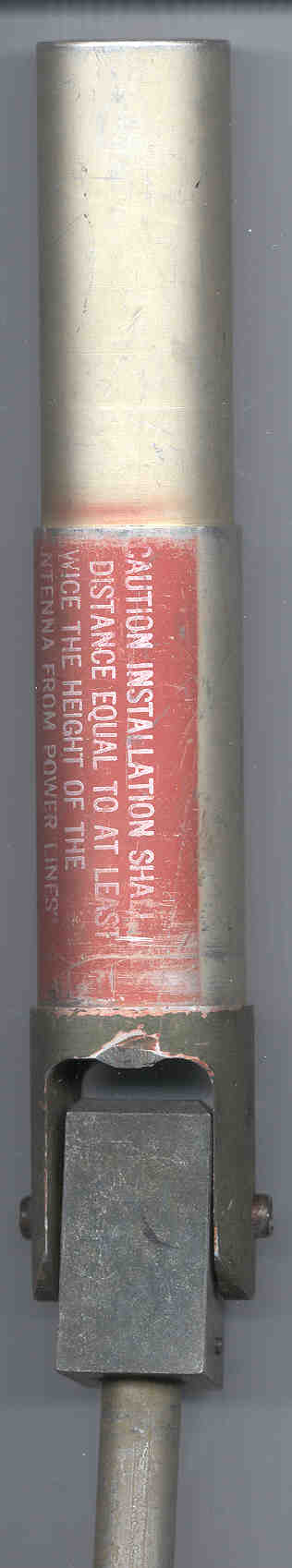 Feedcone Assembly - Red Label: "CAUTION Always use the 30 Inch Insulating Mast Section With This Antenna" The thread in the bottom cone is a little different from the thread used on a broom handle, but it's close. The feedcone consists of a 50 Ohm to 200 Ohm balun transformer driving the upper cone that's all metal and the lower cone that's all metal 180 degrees out of phase with each other. The DC resistance between all the parts is less than 0.1 Ohms. Even with a 4-wire Kelvin Ohm meter I could not see the balun windings. This is probably because the wire used on the balun is big enough to handle 350 Watts of RF power and has a very low DC resistance.