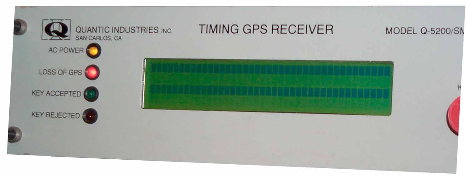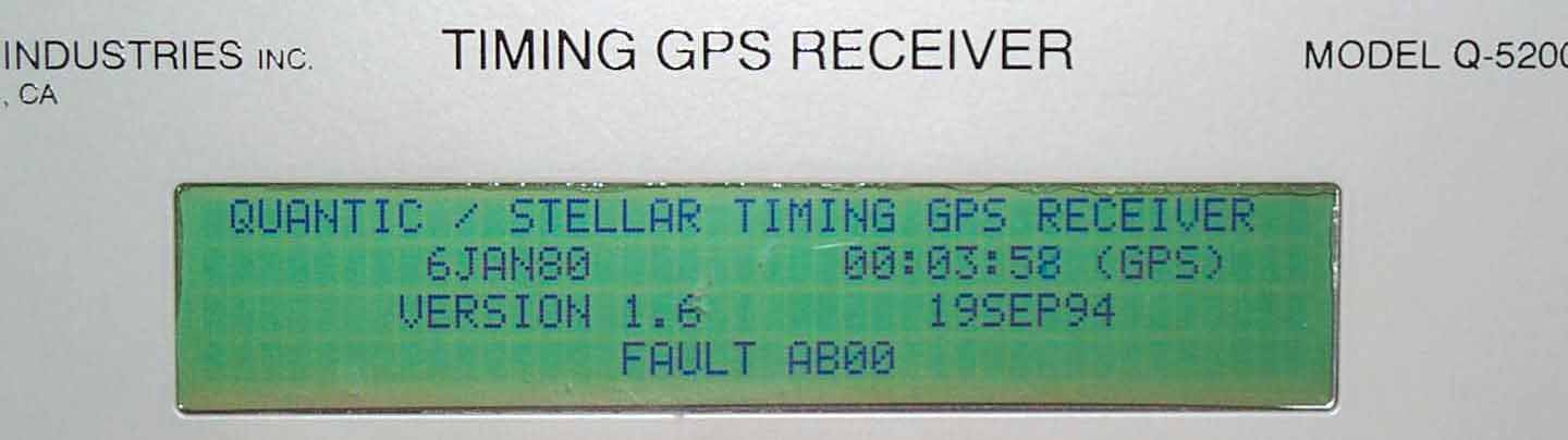 The Display now shows the power up screen: Quantic/Stellar Timing GPS Receiver, 6 Jan 80 (power up date) 00:00:54 (clock that started at power up), Version 1.6 19 SEP 94 (date of version 1.6), Fault AB00.