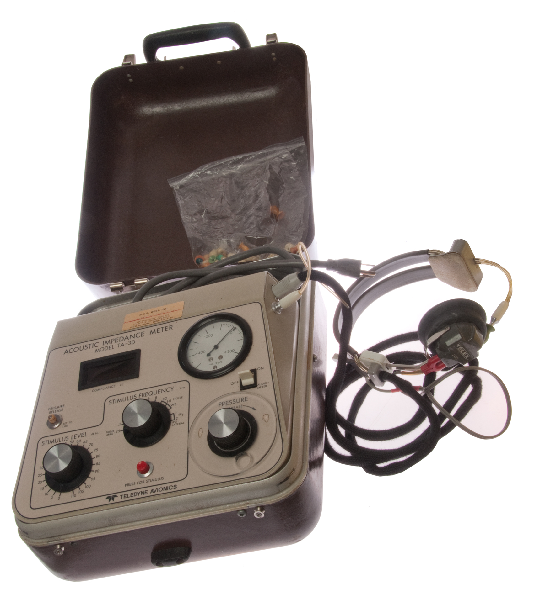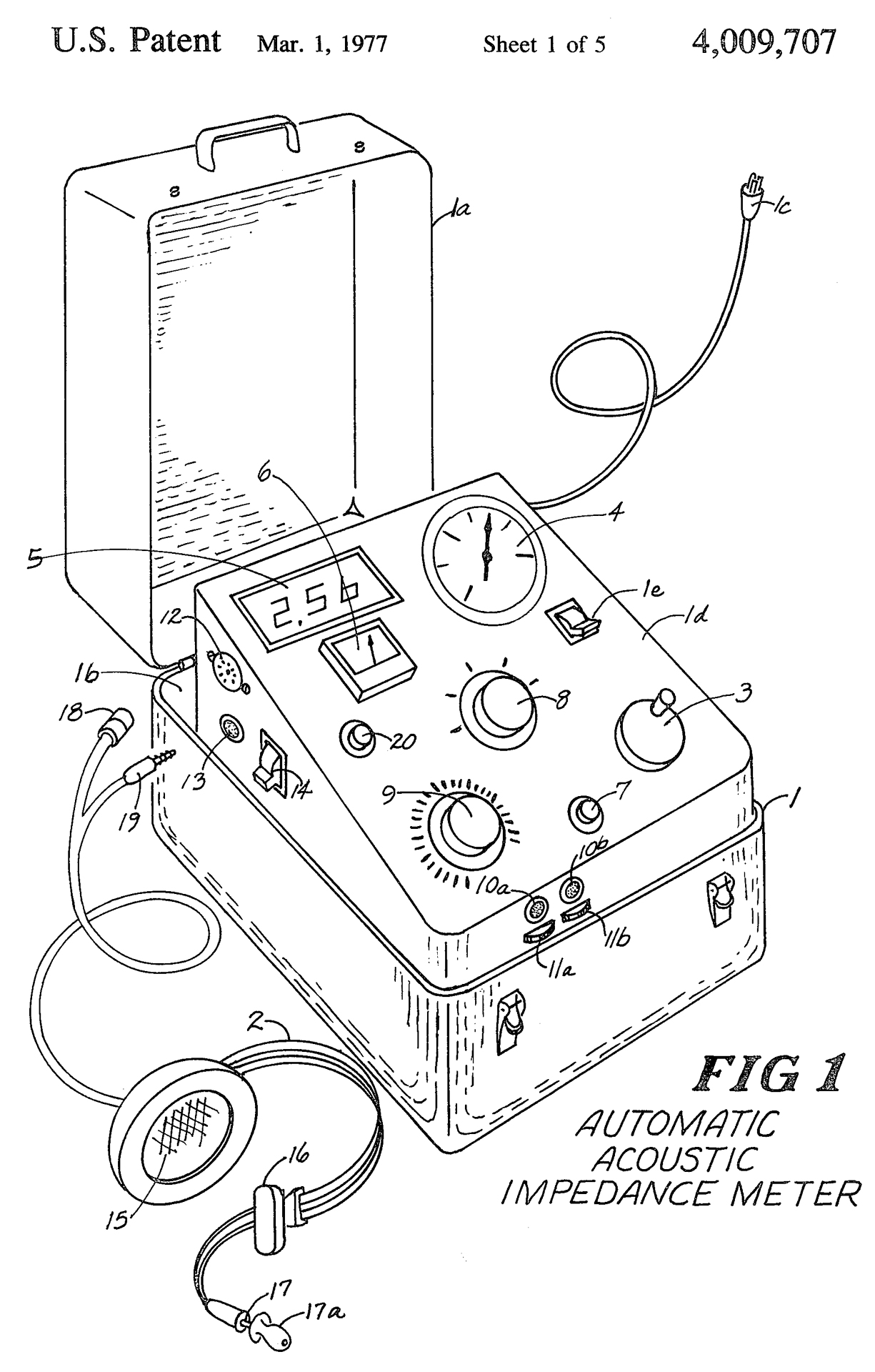 3294193 Acoustic impedance measuring instrument, Jozef J. Zwislocki, Dec 27, 1966, 73/585, 600/559, 600/200, 73/589, 73/645 - early mechanical acoustic impedance of ear