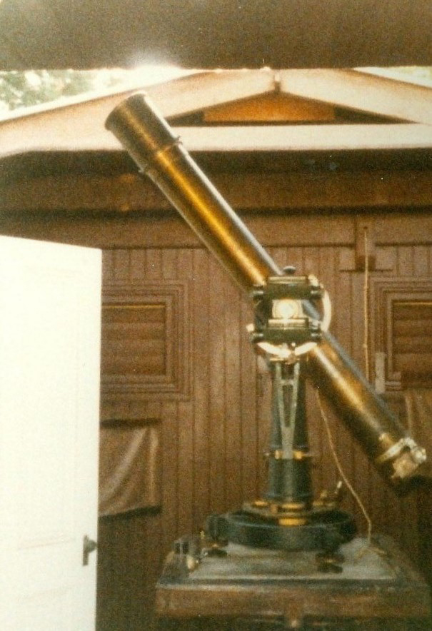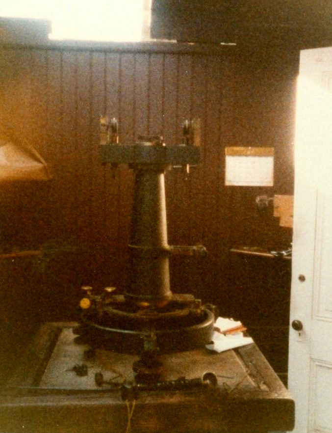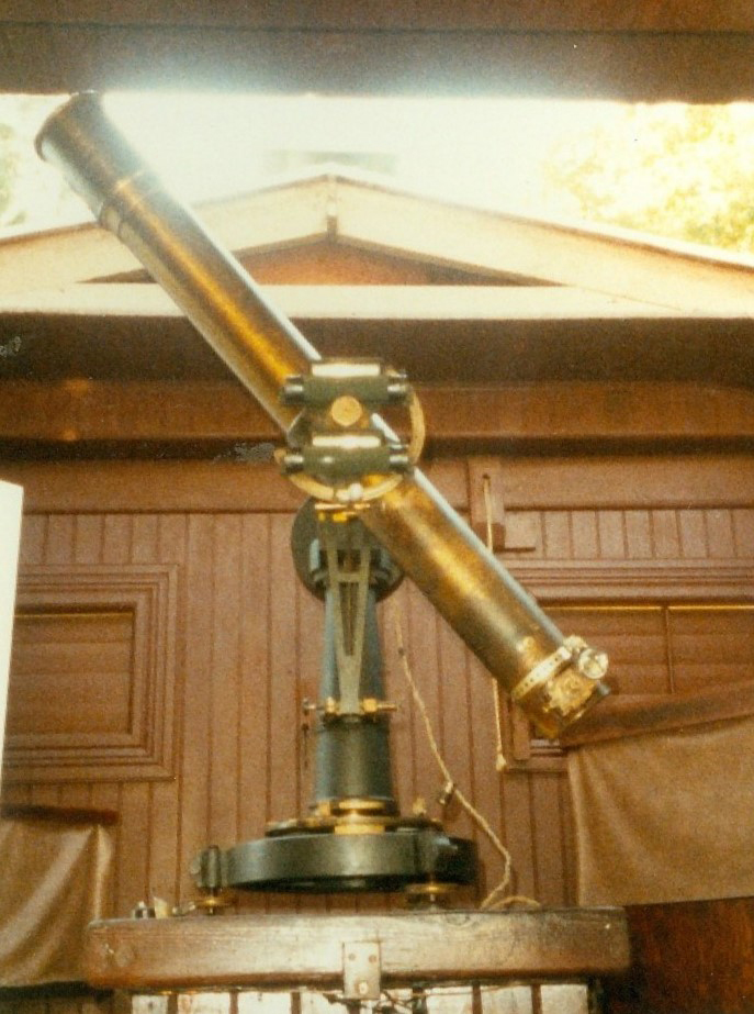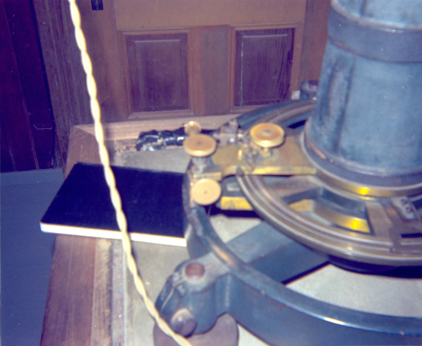 Latitude Observatory Looking South Popular Science Monthly Nov 1909 ![]() Note that the telescope is sitting on a pedestal that's waist high. The reason for the North facing door is so that when the telescope is horizontal it can see a North alignment mark at the top of a waist high concrete pier in the meridian alignment building. |