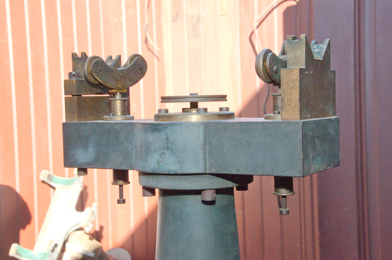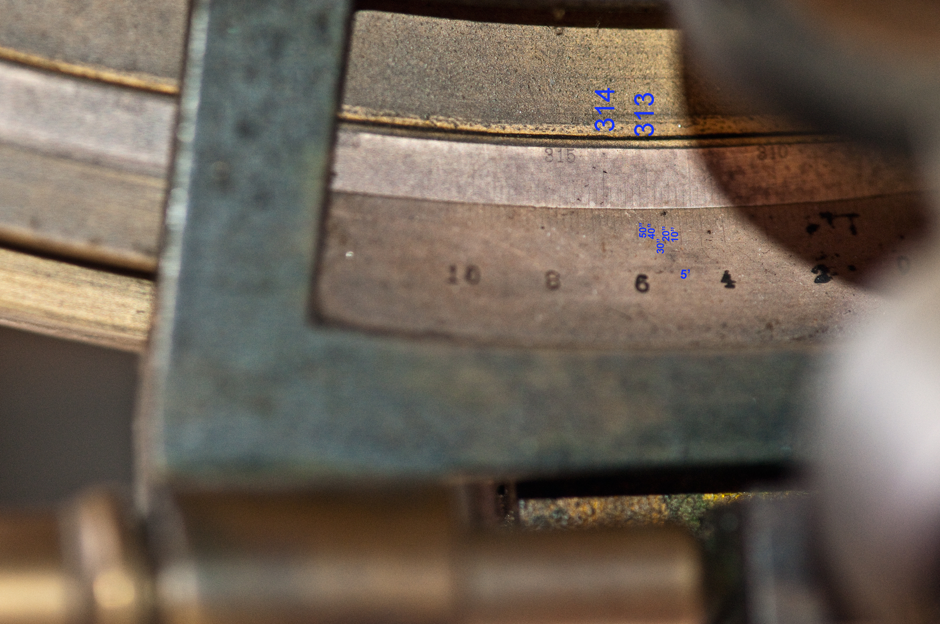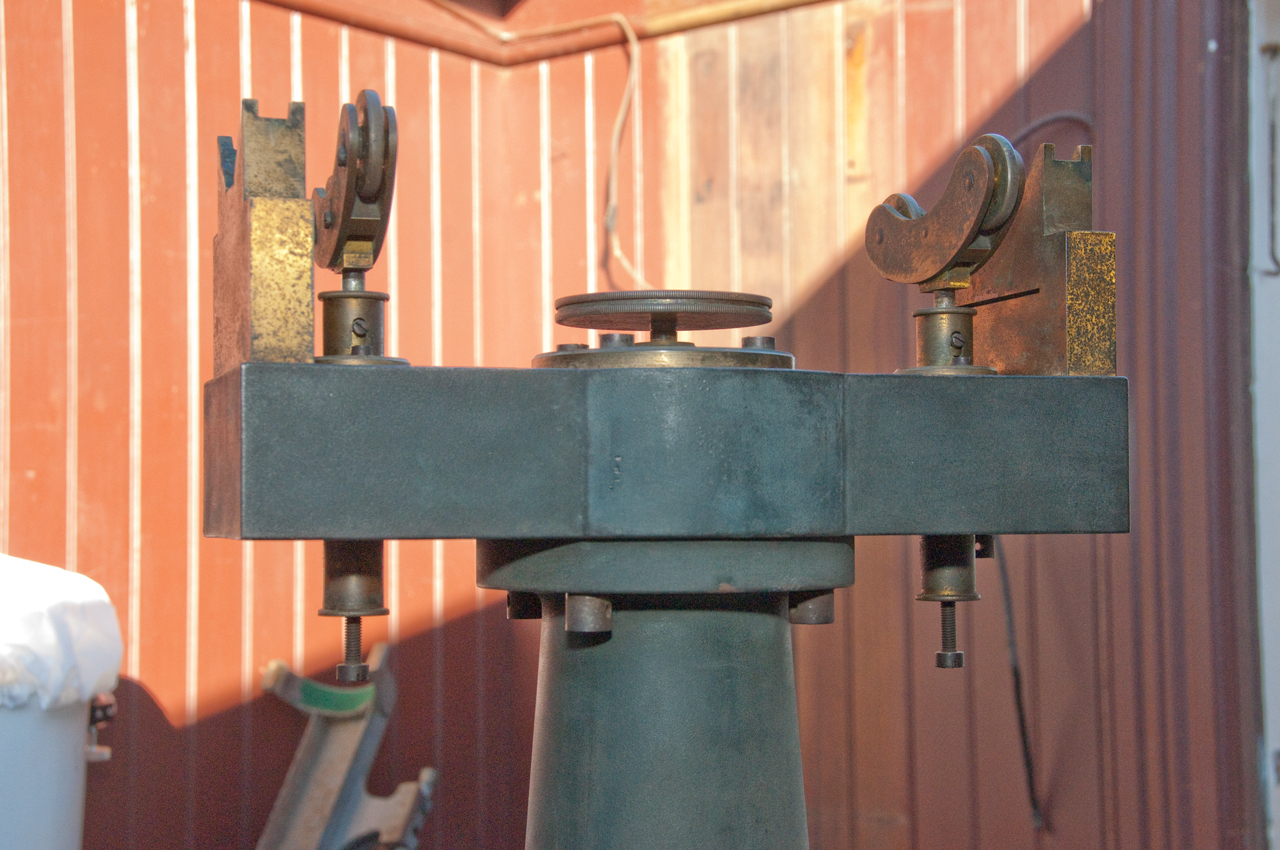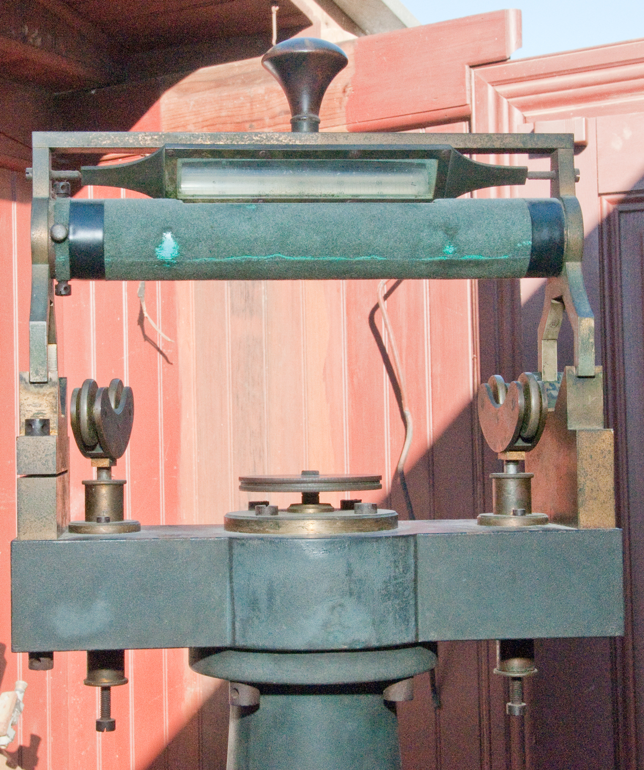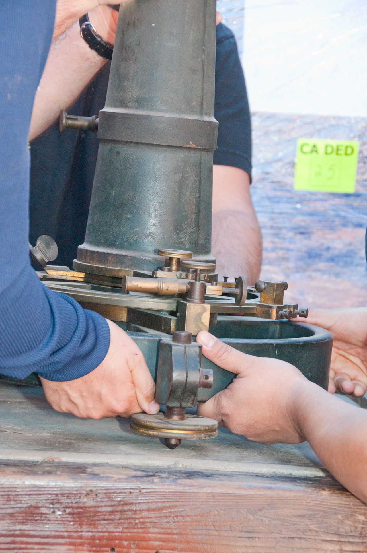 right in this photo The microscope to read the vernier scale (Wiki) is missing. Blue shrink wrapped package in background is the sidereal pendulum clock. Not unwrapped yet, will be in interpretive building. ![]() |