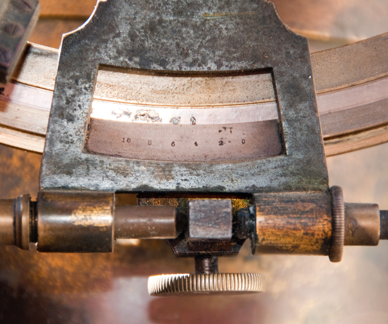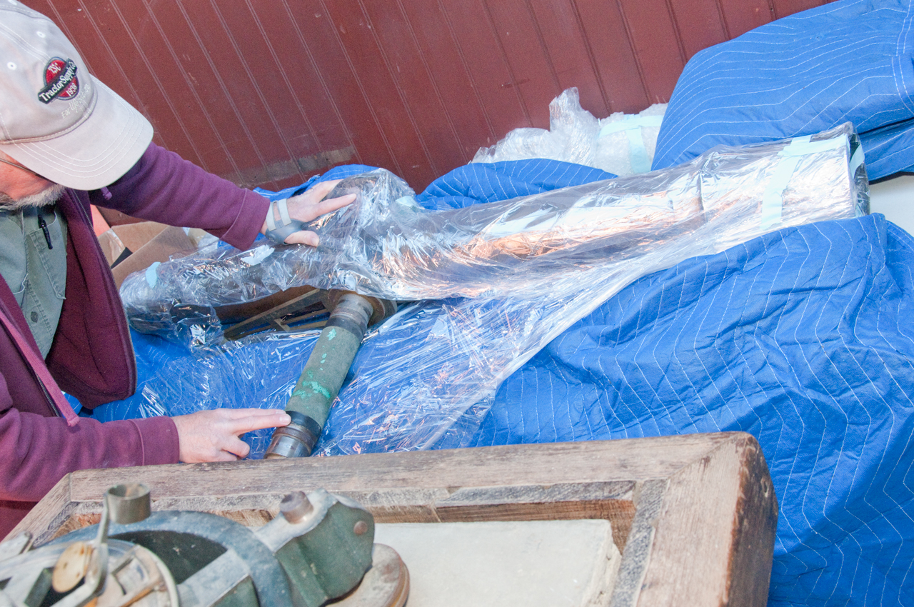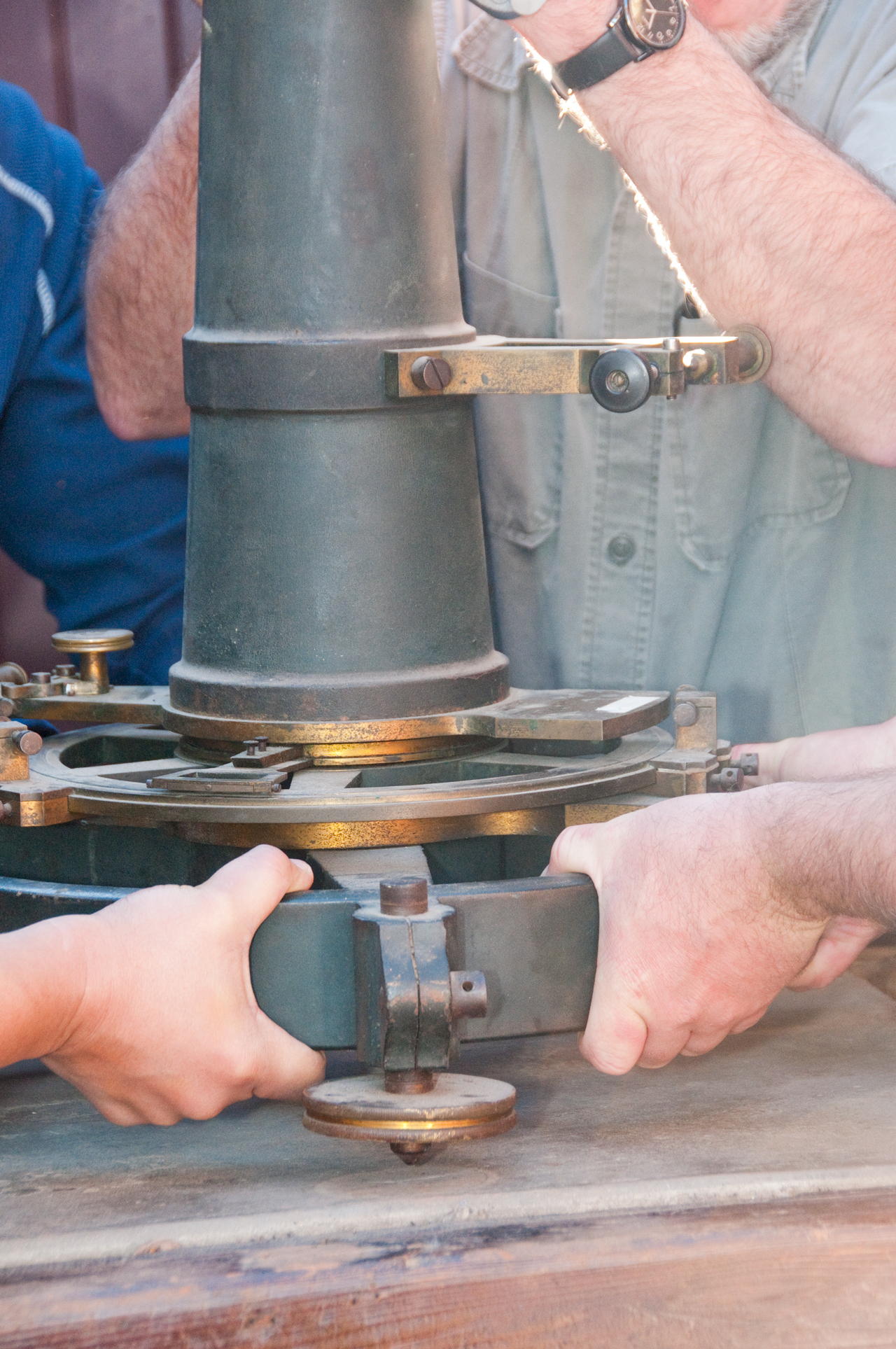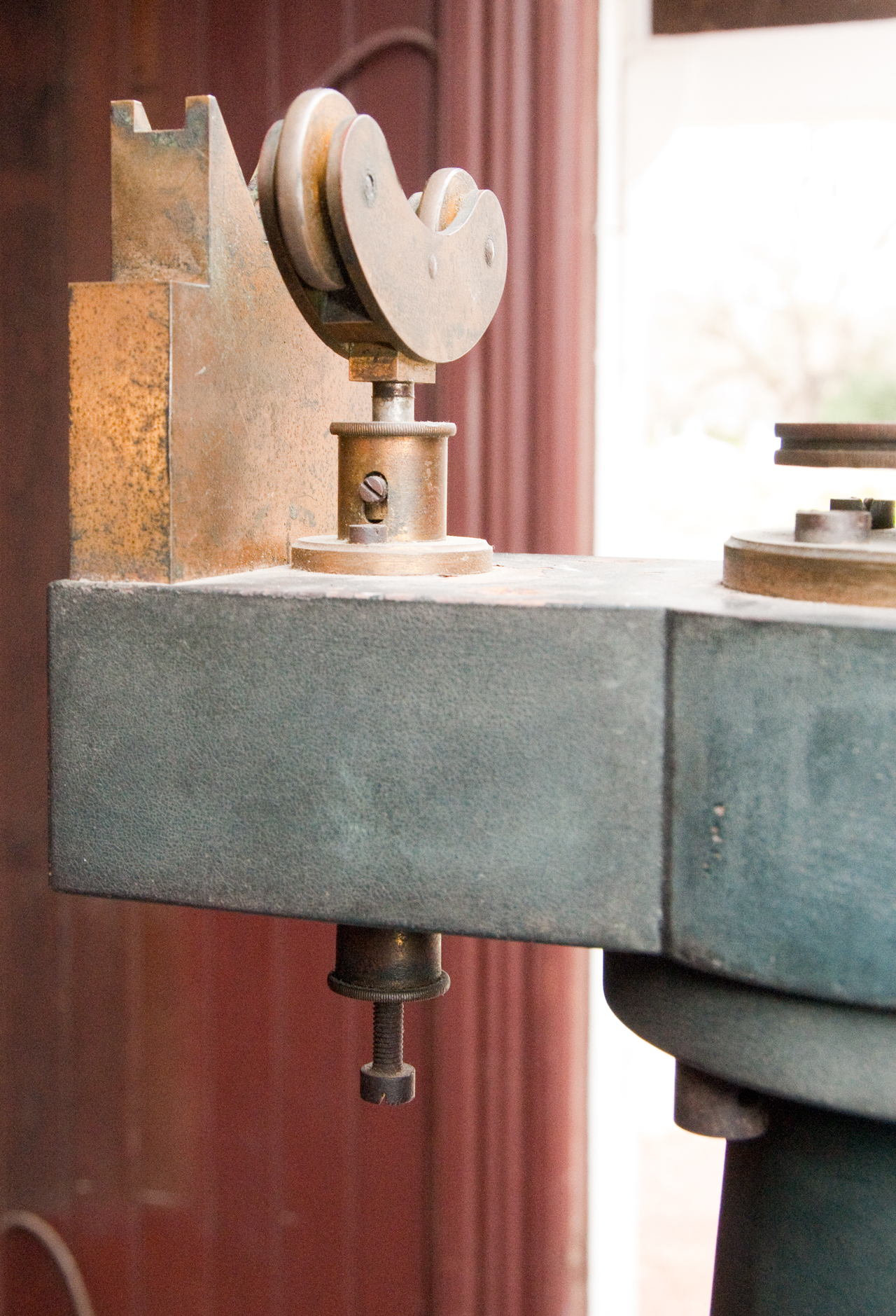 right in this photo The microscope to read the vernier scale (Wiki) is missing. Blue shrink wrapped package in background is the sidereal pendulum clock. Not unwrapped yet, will be in interpretive building. ![]() |