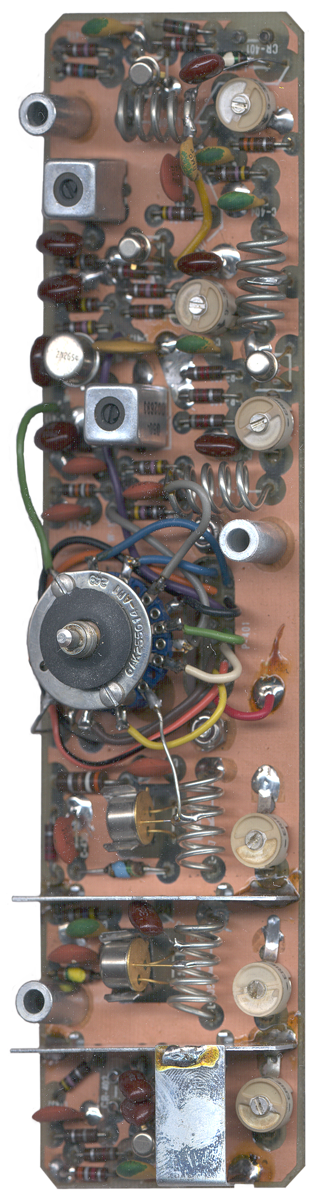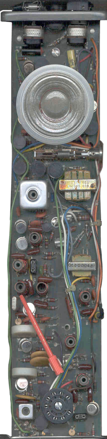 Just to the right of the large IF can there is a piece of string tied to one of the transistors that is on a heat sink. The string runs to the right side where it appears to have been cut off. This probably was a manufacturing tag that was carried with the radio and cut off before installing it in it's case. Note that there is no data plate on this radio by design.