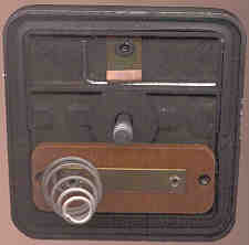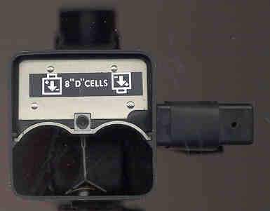 Battery compartment with cover removed. The battery compartment cover has a small allan wrench that can be used to remove the OFF-VOL control. At the bottom you can see the spring release sheet metal tab under the battery compartment separator. Lift this tab and press the chassis out the top.