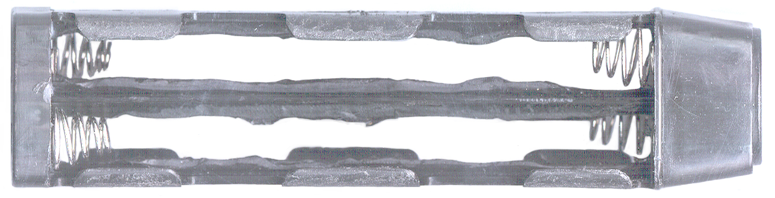 The Trimble AA holder that fits the box looks very much like a BA-5800 battery adapter, BUT instead of having two concentric rings as the contacts it has two contact pads about 0.25 x 0.375". In order to get these small contacts to line up with the mating spring fingers the battery holder has a flat. If concentric rings were used there would be no need for an alignment flat. The reason for this non standard construction is that the Trimble battery holder connects all 8 AA cells in series providing a nominal 12 Volts with Alkaline cells. The Trimpack is rated for 8 to 32 Volts. When you try and run a Trimpack (p/n 14992-20) from a BA-5800 or my adapter you will get a "low battery" warning and the receiver shuts down.