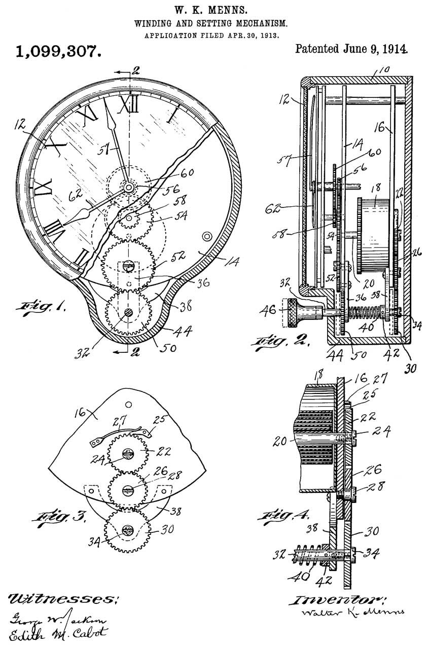 1099307 Winding and setting mechanism, Walter K Menns, Chelsea Clock Co, 1914-06-09, - may be branded Stewart Warner