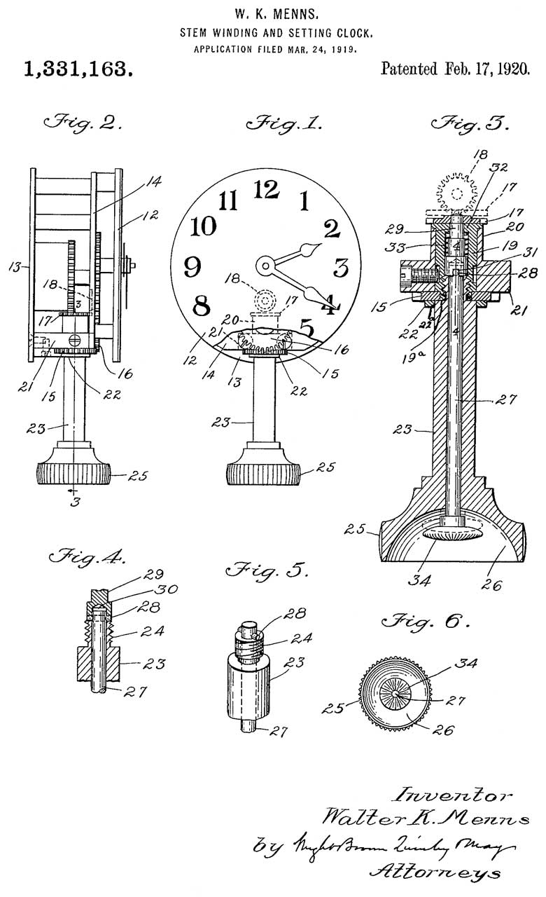1331163 Stem winding and setting clock, Walter K Menns, Boston Clock Co, 1920-02-17, -