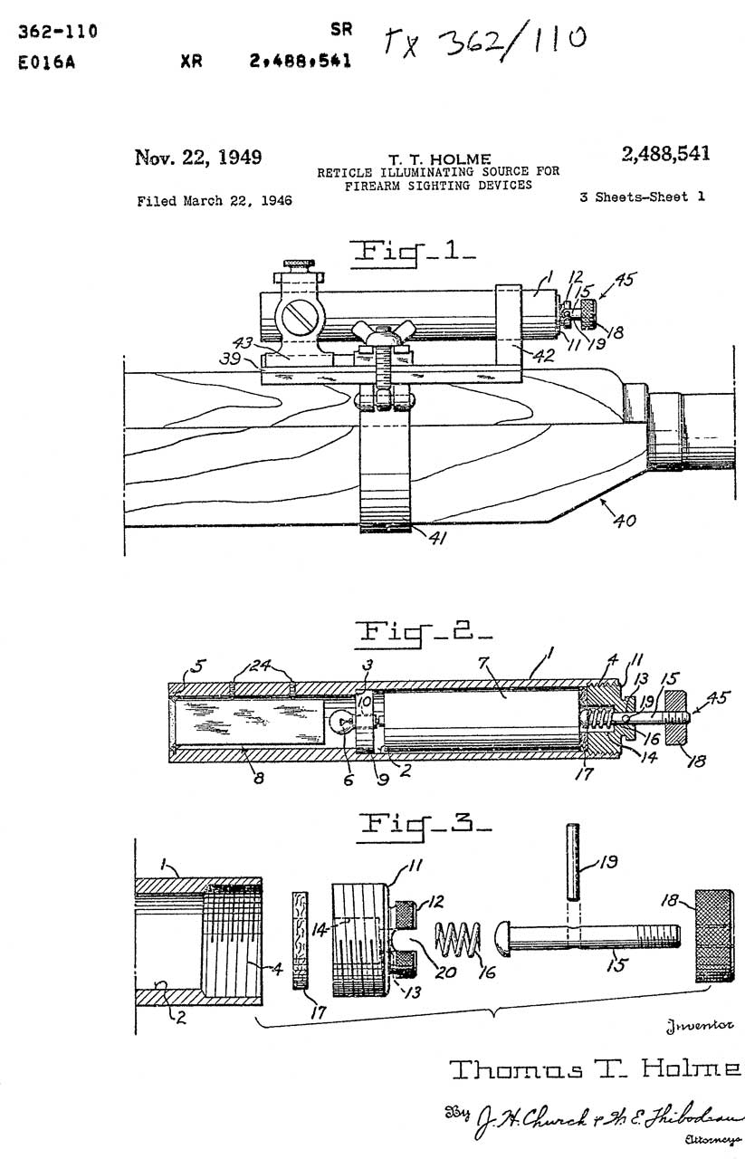 2488541 Reticle illuminating source for firearm sighting devices, Thomas T Holme, App: 1946-03-22, W.W. II, Pub: 1949-11-22, - Armson Oculled Eye Gunsight (OEG) black field of view & illuminated reticle; cited by 14 patents
