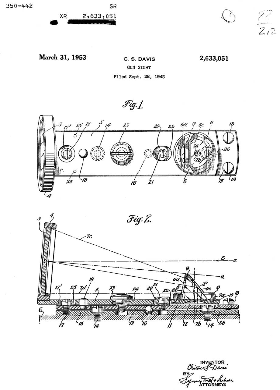2633051 Gun sight, Clinton S Davis, Swain Nelson Co, App: 1945-09-28, W.W. II, Pub: 1953-03-31, - Nydar Model 47 Shotgun Sight