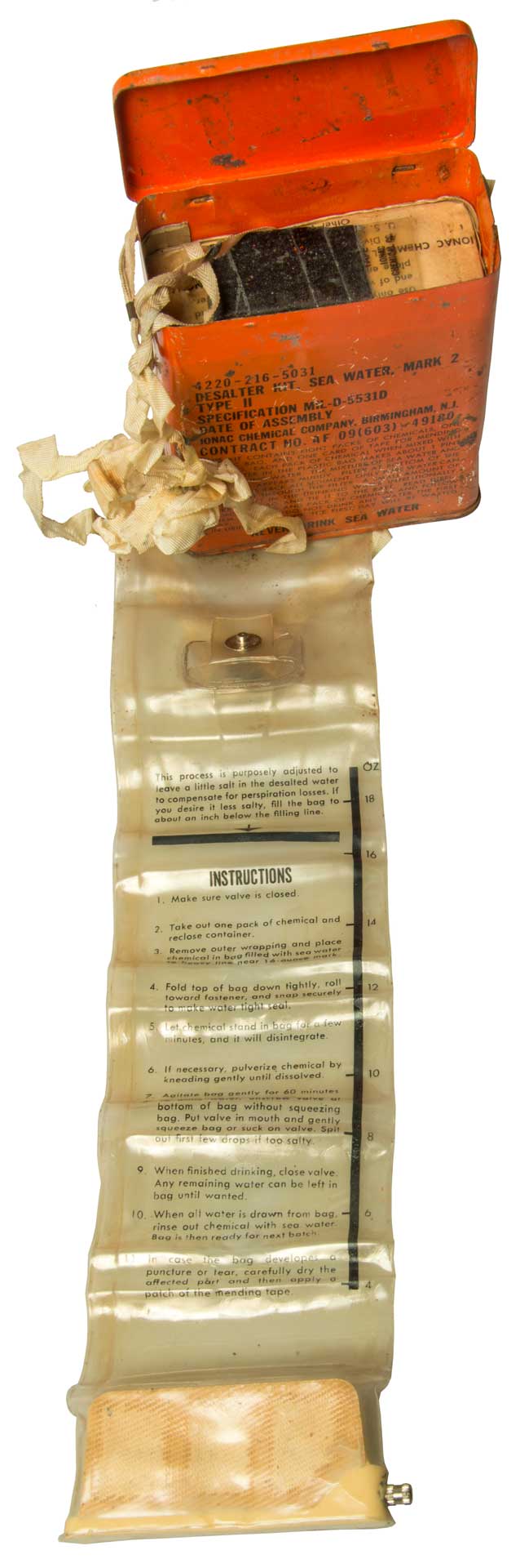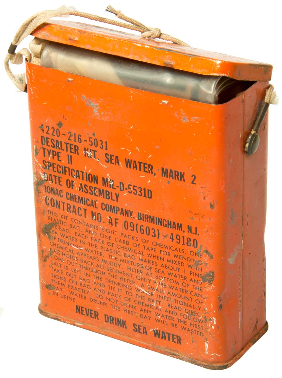 Some type of Seawater Desalter Kit would be included in aircraft survival kits when the route has an overwater ("feet wet") leg.