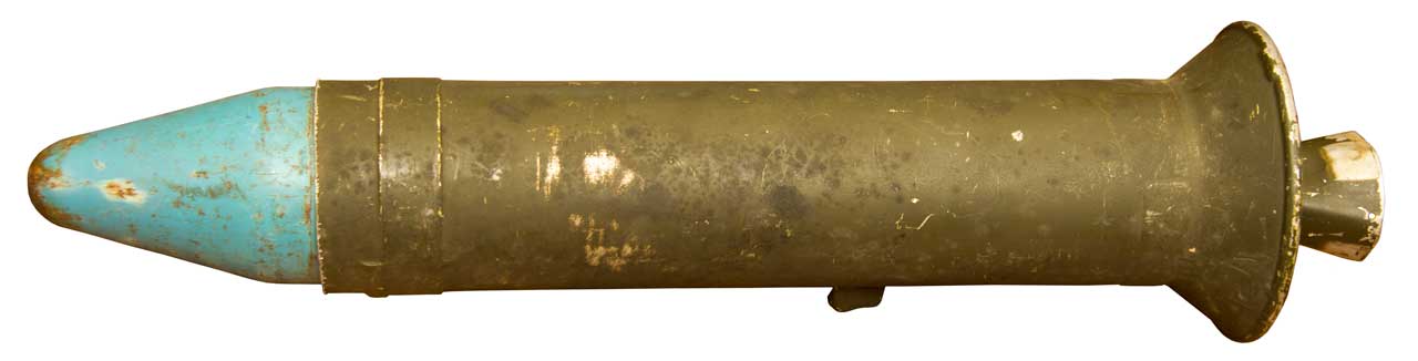 [pg 132] "The launcher length of barrer, fourteen inches, evolved as the length to make it unlikely that the gunner would accidentally get his fingers in front of the muzzle on firing. The barrel length required for interior ballistics was only a few inches, as the pressure dropped quite rapidly. Peak pressure on the low side is only three thousand pounds per square inch, compared to thirty thousand pounds per square inch in the high pressure chamber."