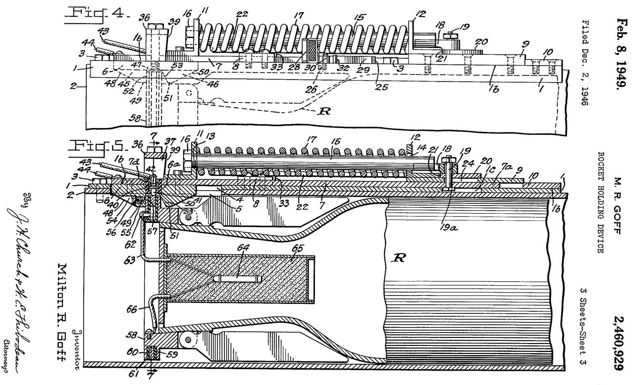 2460929 Rocket holding device, Milton R Goff, Sec of War, App: 1946-12-02, W.W. II, Pub: 1949-02-08, - Cited by 26 patents.