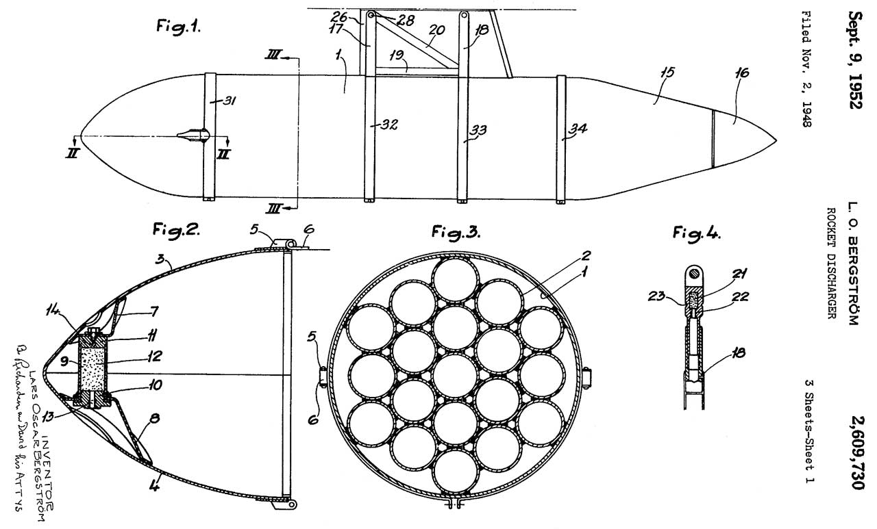 2609730 Rocket discharger, Lars O Bergstrom, Saab Bofors, 1952-09-09, - 19 rockets in a pod.