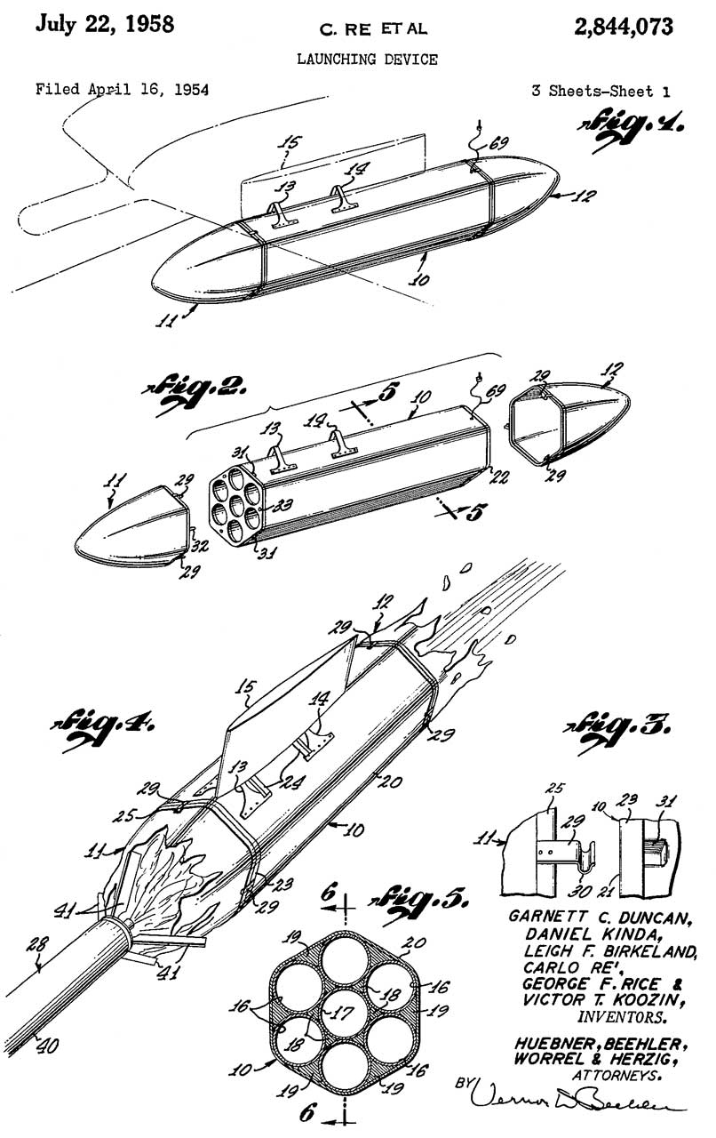 2844073 Launching device, Re Carlo, George F Rice, Leigh F Birkeland, Victor T Koozin, Garnett C Duncan, Kinda Daniel, Royal Industries Co Ltd, 1958-07-22, - 7-tube pod for FFAR. Supports ripple fire. mounts to bomb rack or Pylon.