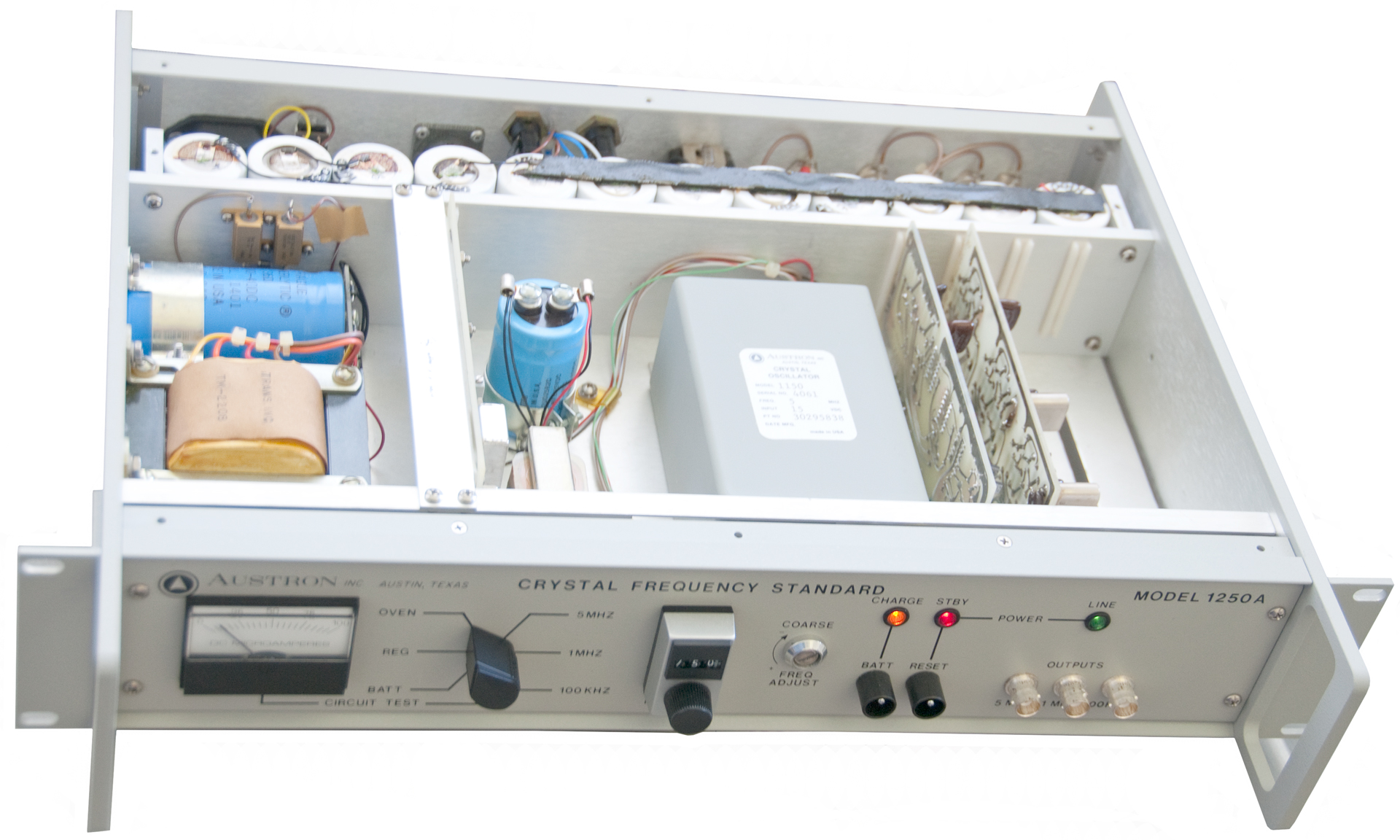 This is part of my passion for Time and Frequency. Frequency standard frequencies started out in the audio range with very large crystals and have moved up in frequency over time. The current frequency for standards is 10 MHz and the prior frequency was 5 MHz. So this standard is at the prior standard frequency. The dates associated with this 1250A are 1984 (contract date) and 1987 (manual date).
