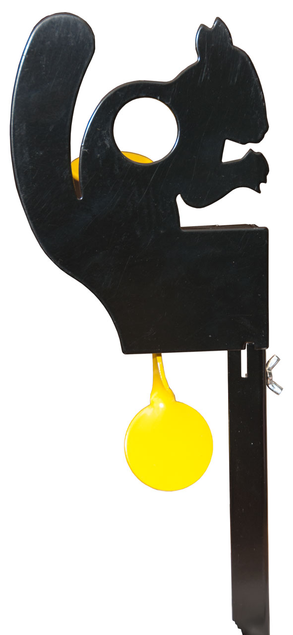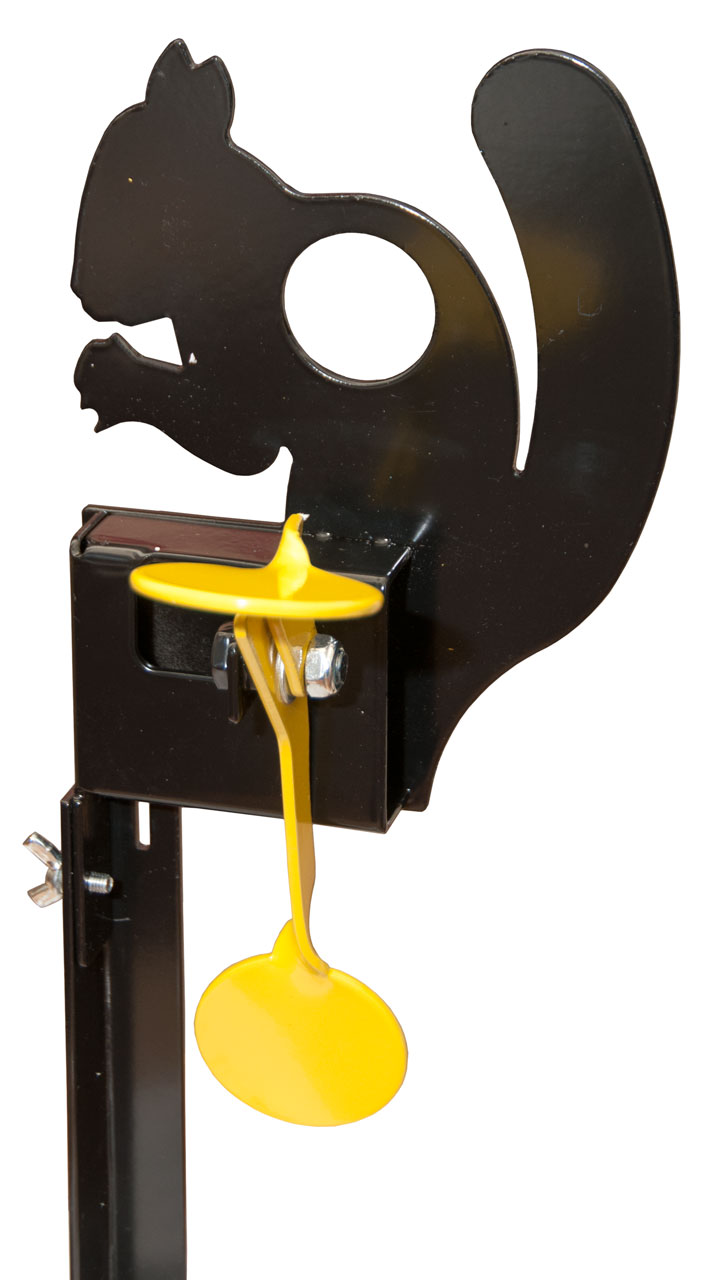 This is a pellet only target (.177 up to 1200 F/s or .22 up tp 950 F/s. When the main target is hit it falls back out of sight, when the lower reset target is hit the main target reappears.