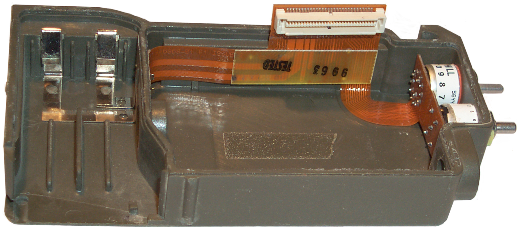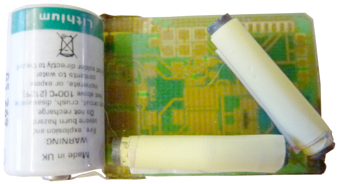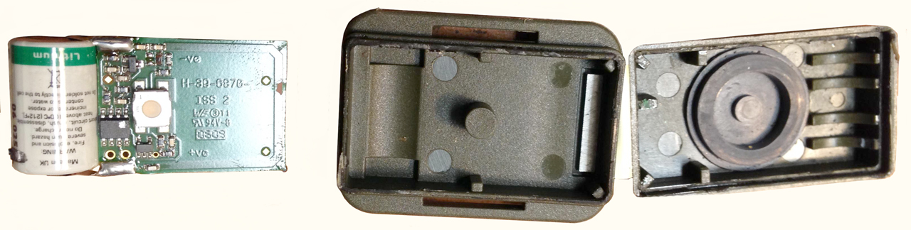 Supplied with a black adjustable strap and buckle. Uses LST14250 battery with tabs. Photos supplied by Dick. Opened using chisel to separate case halves.