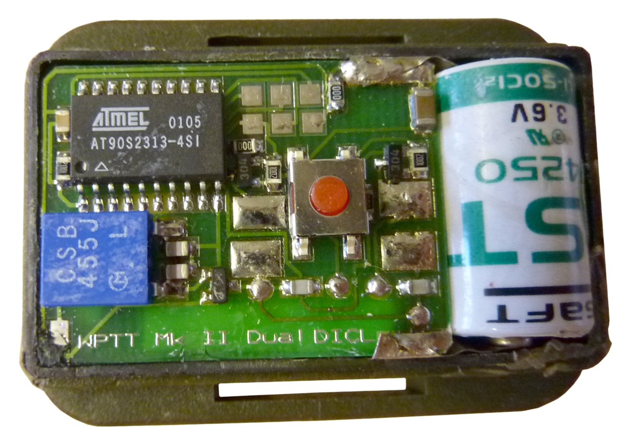 If you know anything about this let me know. Atmel 90S23213 8-bit microcontroller (uC) CSB455J muRata 455 kHz resonator I expect that it's programmed on the board hence the 2x3 group of pads plus other pads for power, ground and ??? There are a couple of loopstick antennas, but there's no other IC that could be associated with them, so some direct connection to the uC? The case is marked: PROGRAM P08230200 100495 Where is the magnet to trigger radio affiliation? ans. under the word "PROGRAM" like the other WPTT units. |