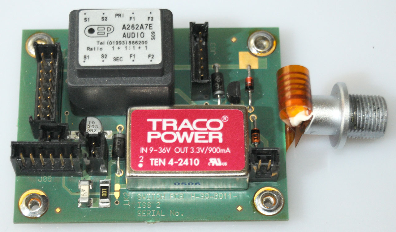 component is a power supply. marked: Traco Power In: 9-36 V Out: 3.3V 900 ma Ten 4-2410 The silver rectasngular component is an Eisen audio transformer marked: A262A7E Audio Tel (01993)886200 The box is a Hammond 1590-NI |