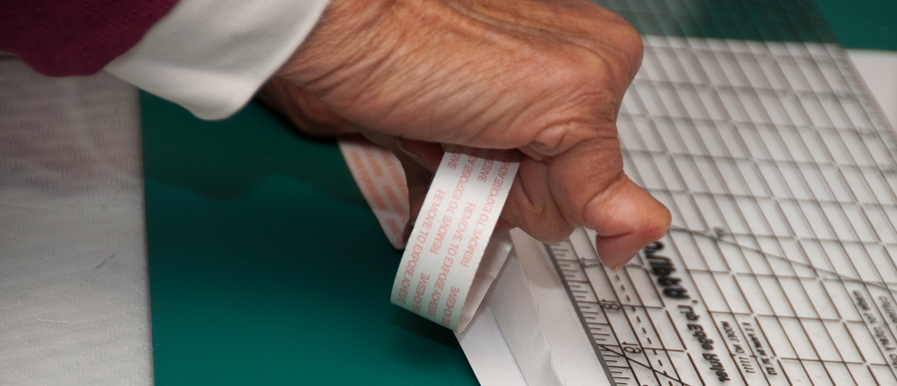 - On the feed (a narrow edge) separate the fabric and backing and insert double sided tape as a stiffener.