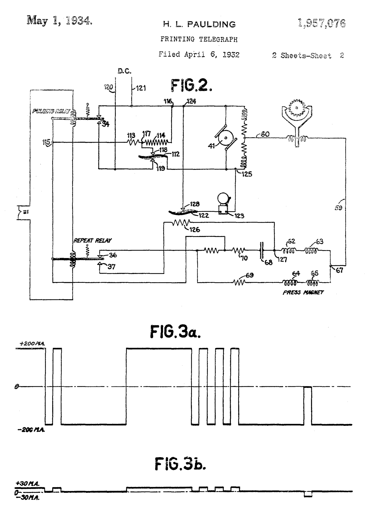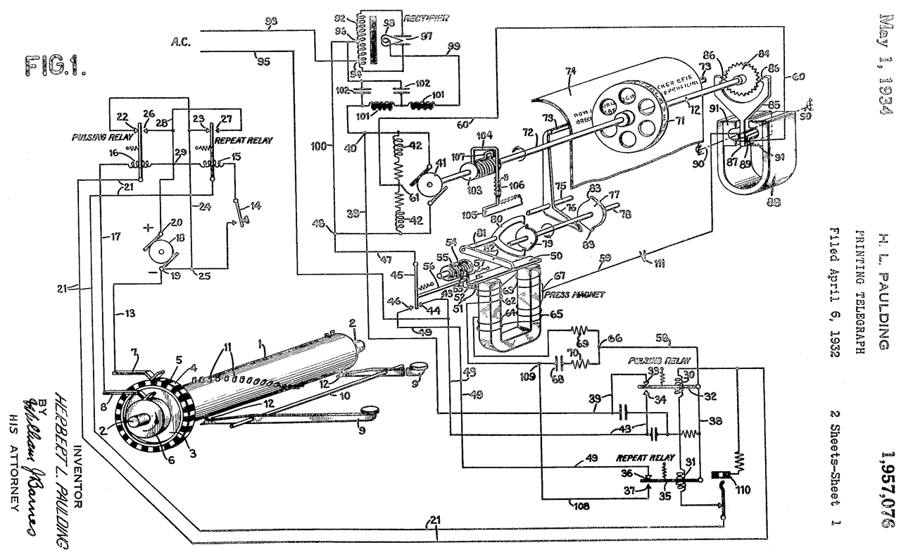 1957076 Printing Telegraph, H.L. Paulding (Financial Press Companies), May 1, 1934, 178/4.1R ; 178/23R; 178/28 This includes a schematic of how the transmitter is wired to the system and this printer. Note: Bipolar signal in Fig 3a. |
