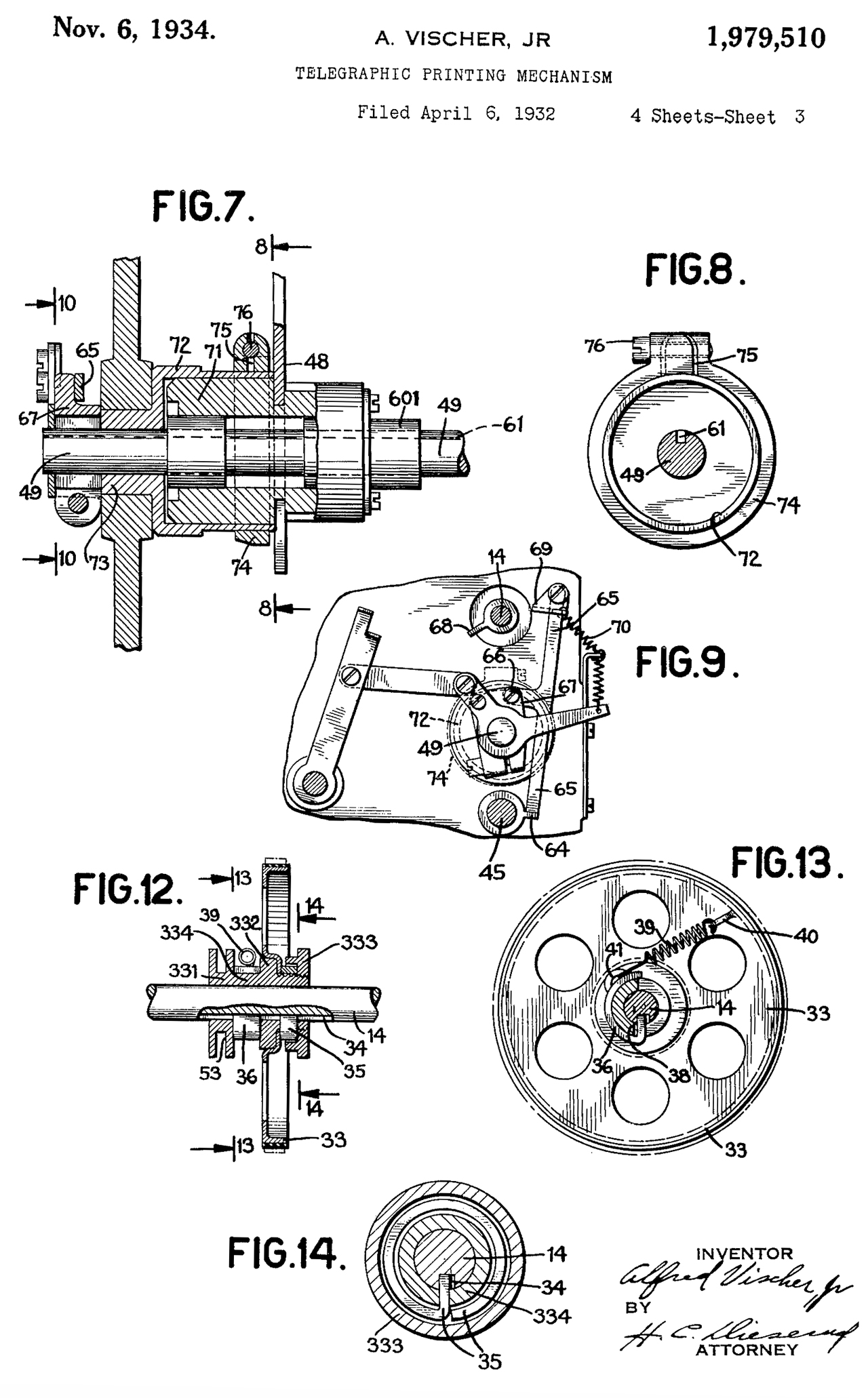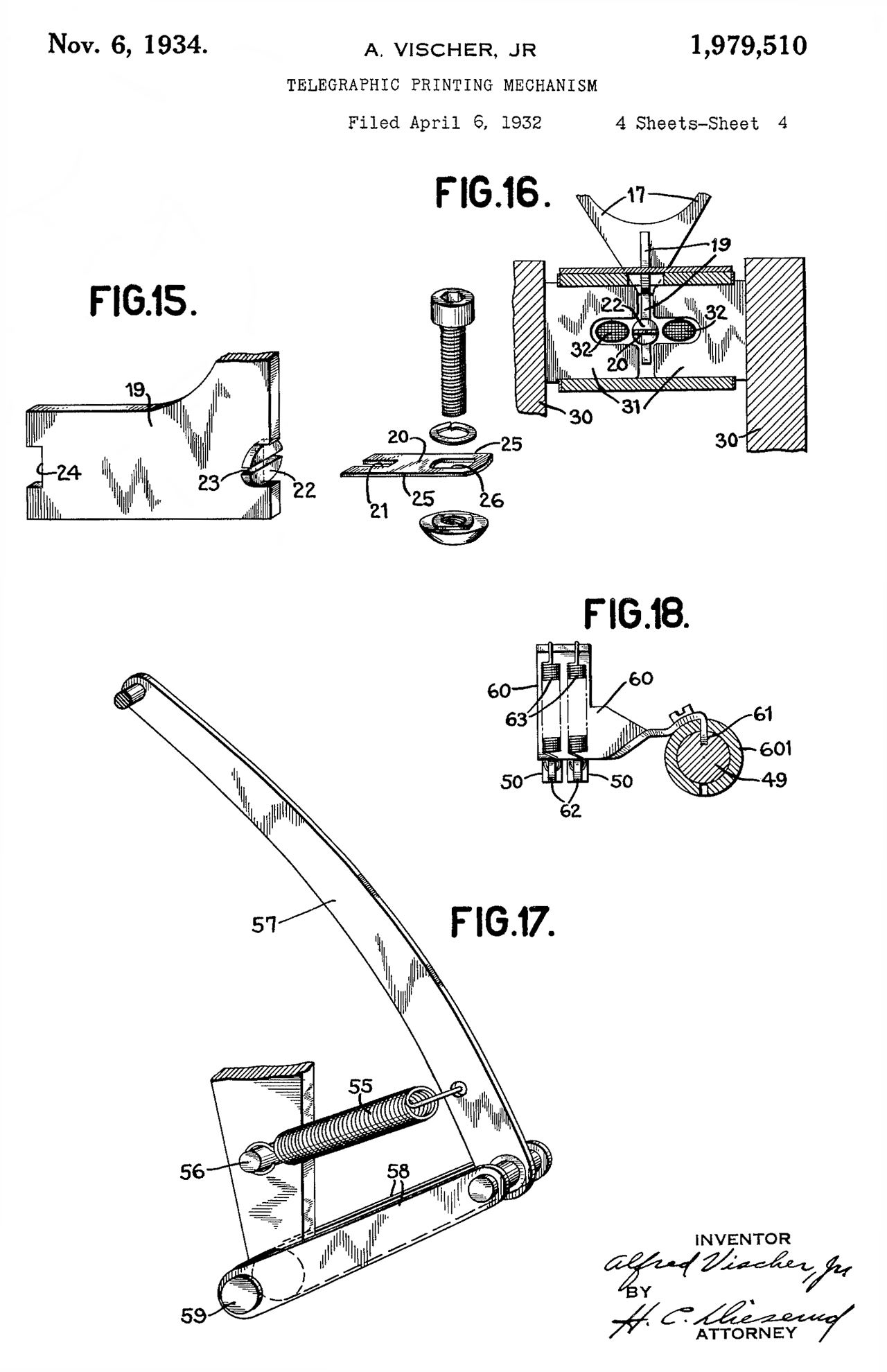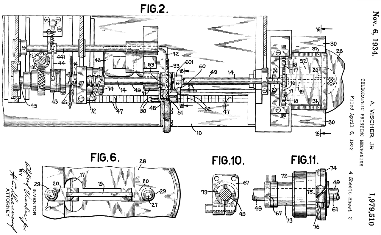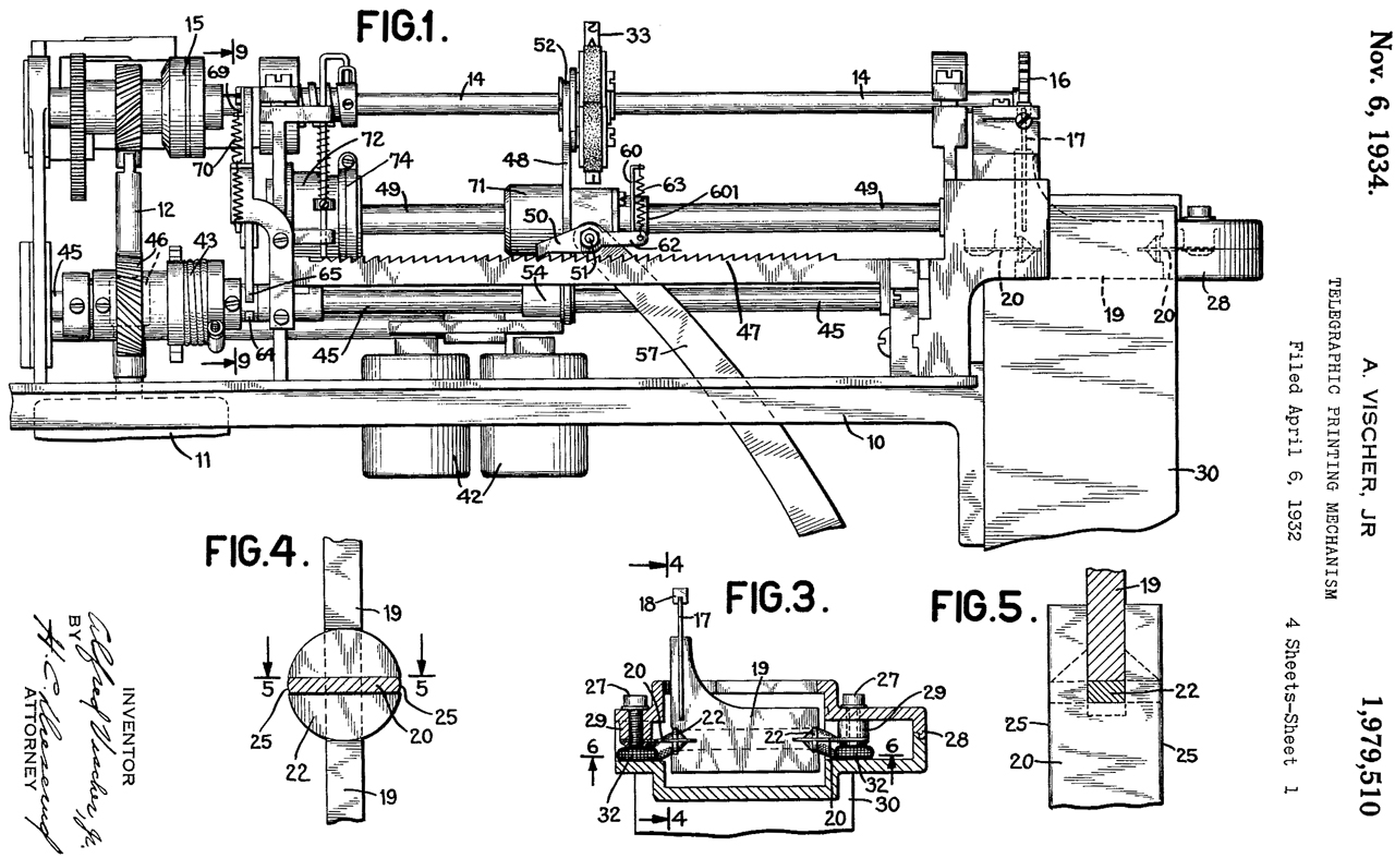 1979510 Telegraphic Printing Mechanism, A. Vischer Jr.(Financial Press Companies), Nov 6, 1934, 400/320 ; 16/94R; 178/27; 188/316; 267/124; 267/64.15; 400/174; 400/322; 400/328.1; 403/318; 403/356; 451/233; 464/106 This appears to be this printing mechanism! Calls: 1957076 (see above) |