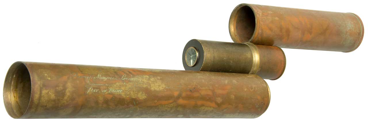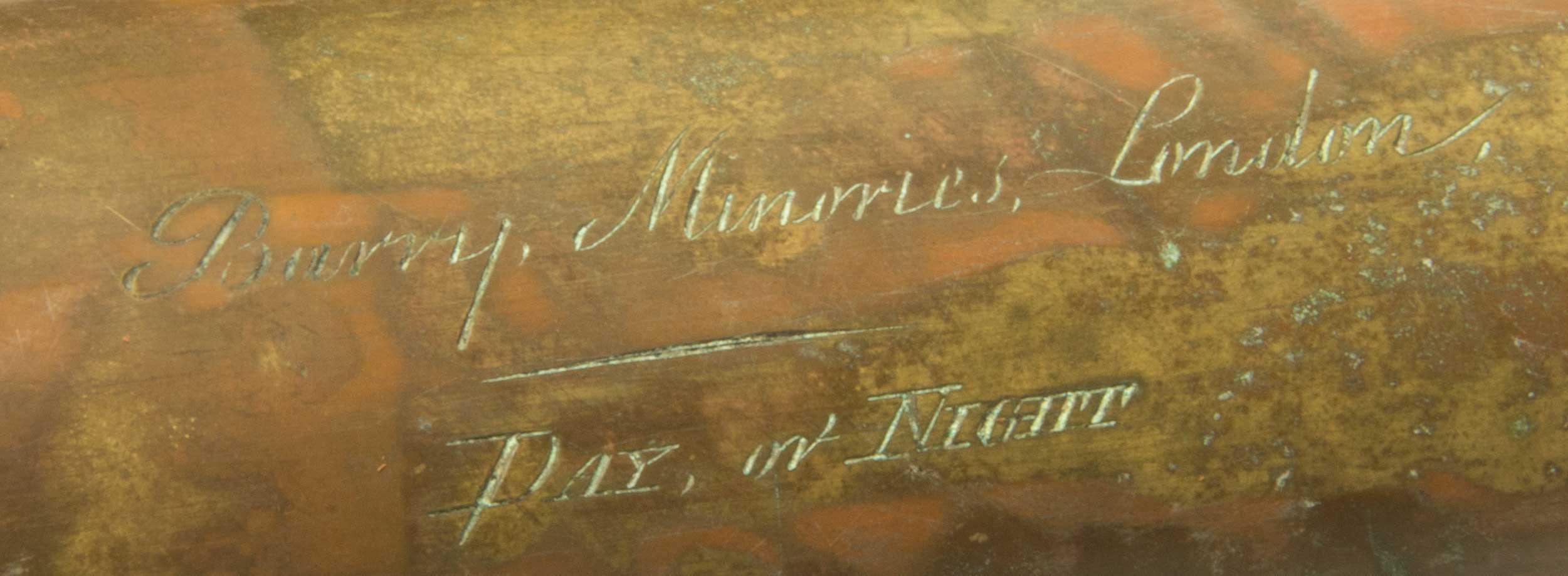 This Day or Night single draw telescope was made by Barry on Minories St., London. The same design was also made by Dollond & Aitchison (Wiki), Doland (Wiki), London; T. Harris & Son, London; Richardson, London; Watkins & Hill, Charing Cross London; George Dixey, London made a triple draw version.