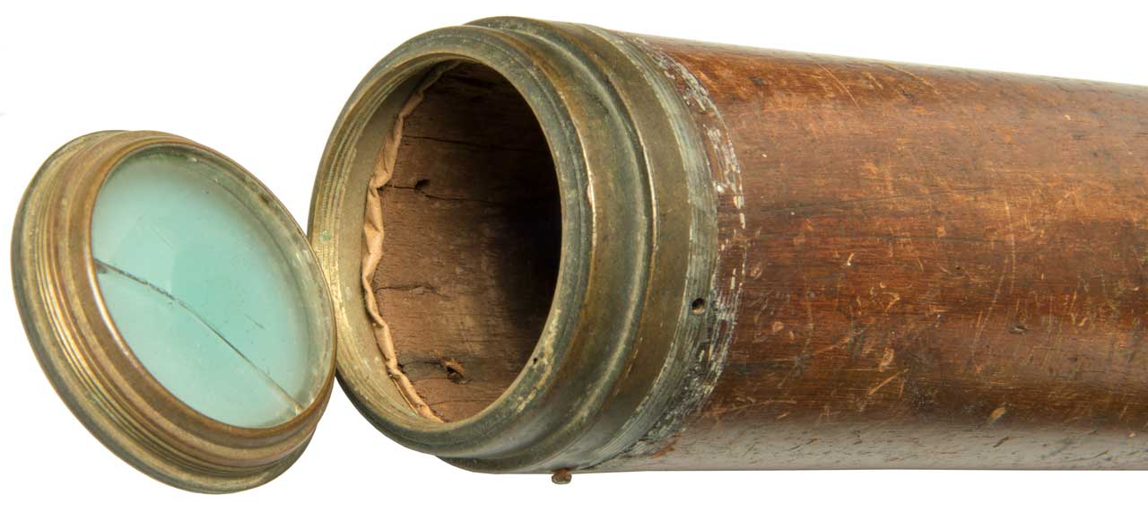 Ref 4.Vintage telescope masterclass - Hand-held telescopes (Part 1), 12:49 - 1750 single draw "day or Night" guillotine eyepiece protector, single element objective lens stopped way down to improve chromatic aberration, Main tube is made of wood, not brass,