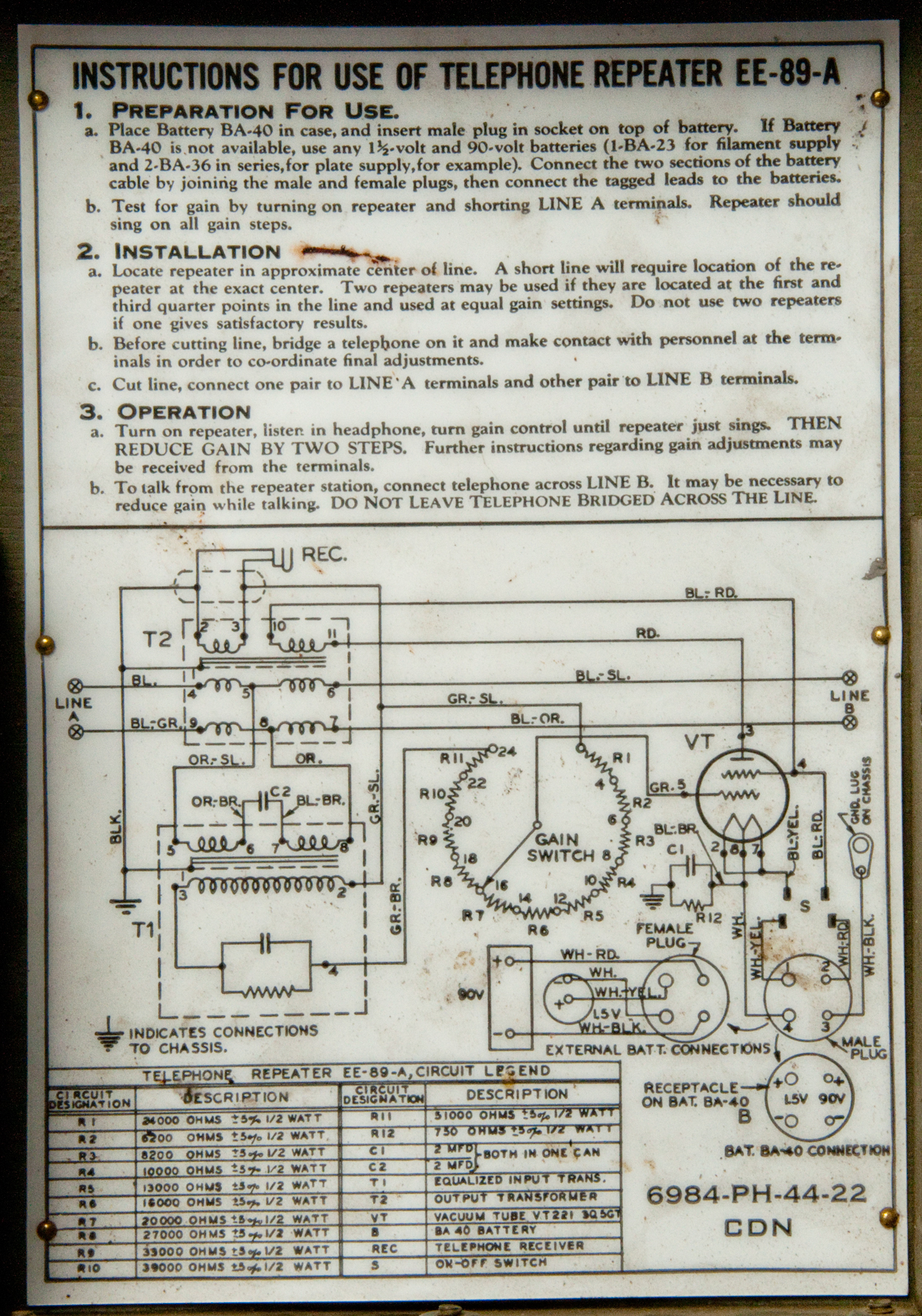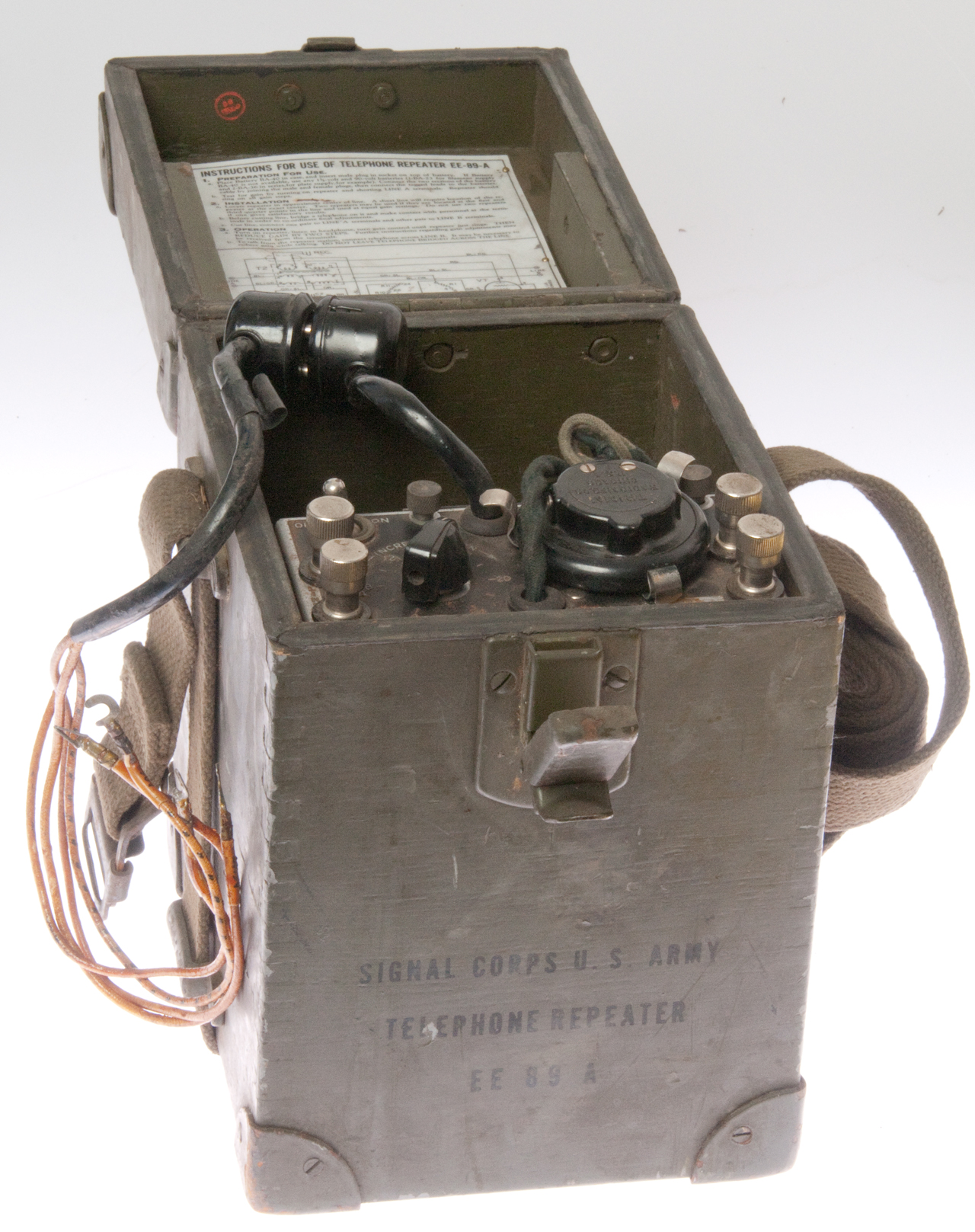 US Army Signal Corps: Telephone line transmission equipment - EE-89 "Two wire voice frequency intermediate repeater for use on lines with 20 or 1000-cycle signalling. Provides thru simplex telegraph operation. Uses one battery BA-40 which last for about 2 weeks."