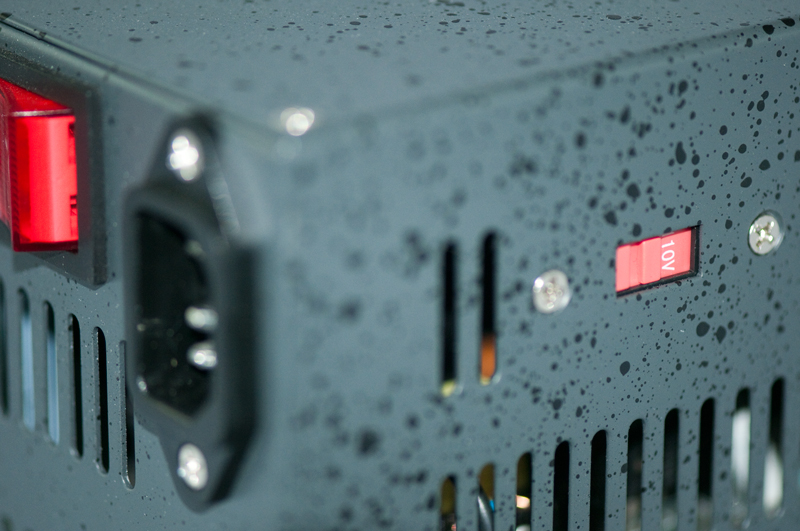 On the panel adjacent to the IEC socket there's an 110/220 VAC