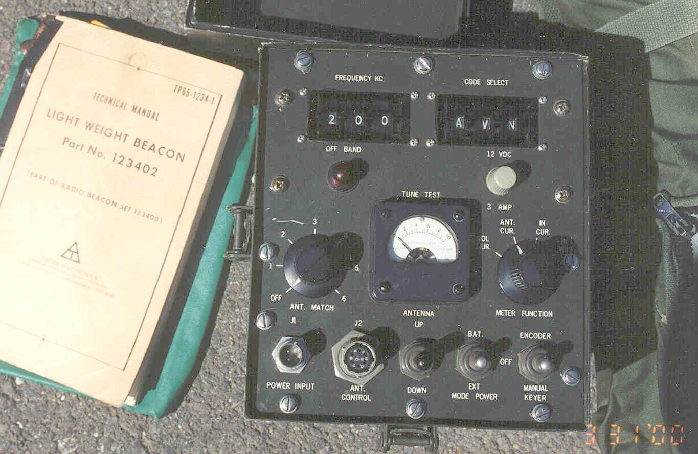 This is a one man back packable Light Weight Beacon. It includes a transmitter, 50 foot high antenna, and auxiliary parts. It was intended to be used as a navigational beacon for helicopters. A standard Non Directional Beacon (NDB) receiver found in most aircraft can be used for homing.