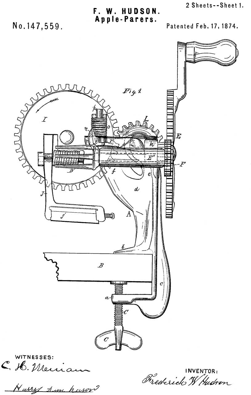 124272 Improvement in Apple Parers, F.W. Hudson, March 5, 1872, 99/599 82/128 -