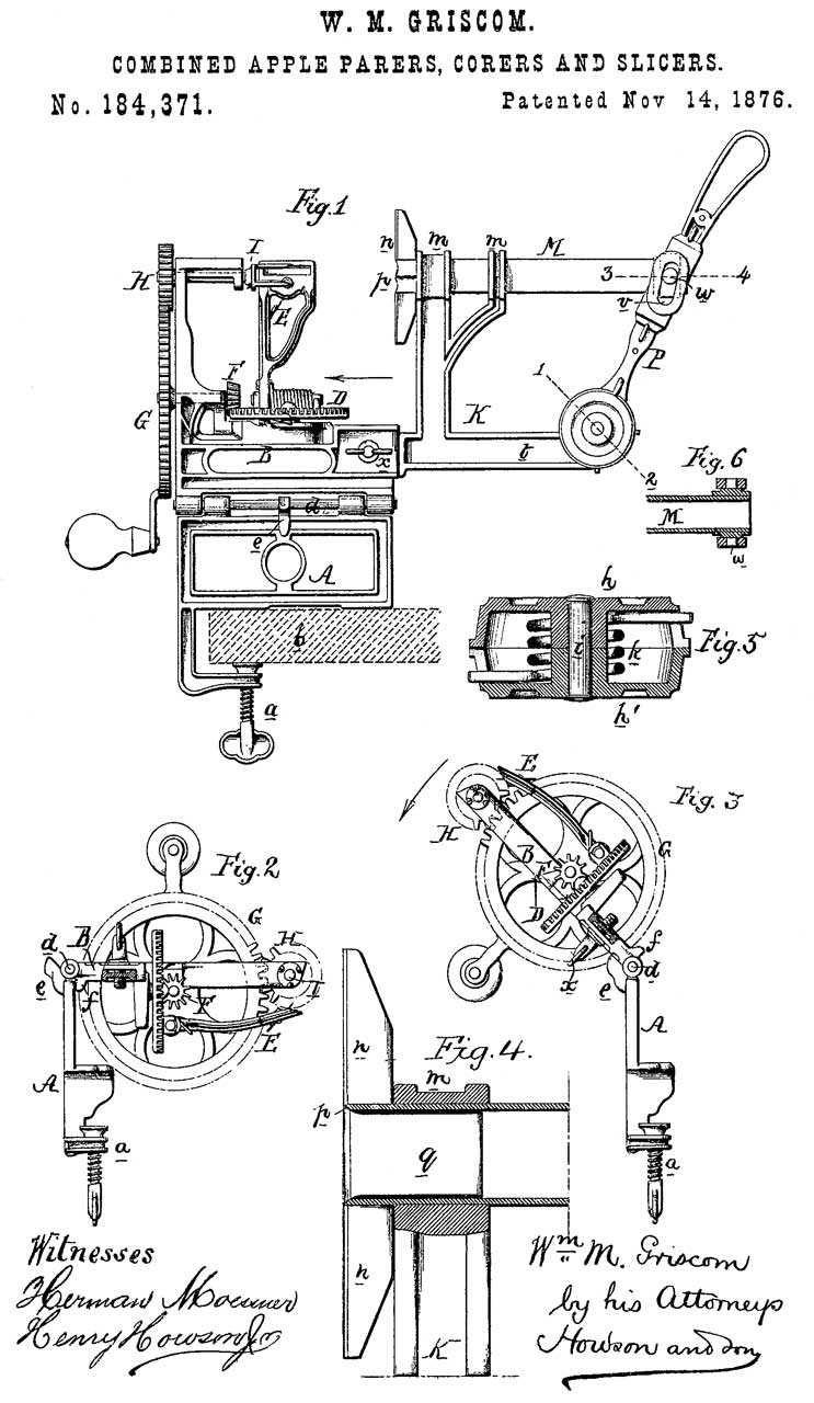 184371 Combined apple Parers, Coreres and Slicers, W.M. Griscom, Nov 14, 1876, 99/543 99/599 -