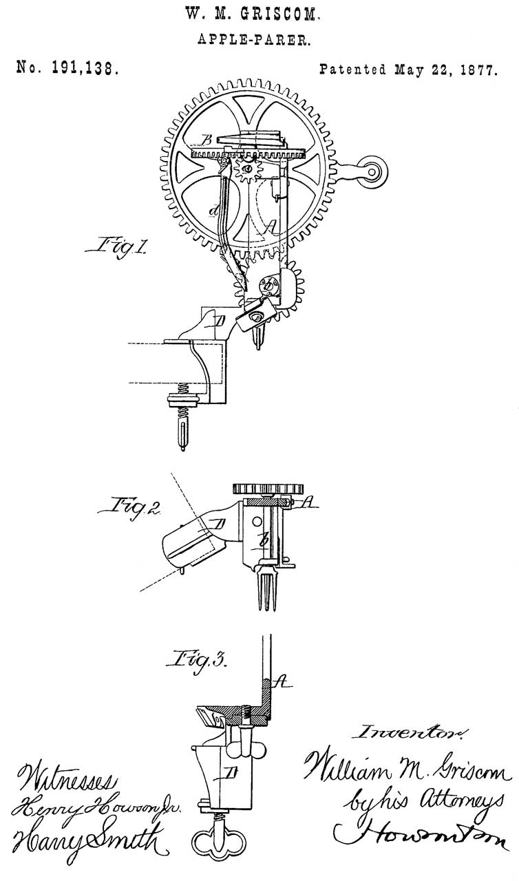 191138 Apple Parer, W.M. Griscom, (Reading Hardware) May 22, 1877
