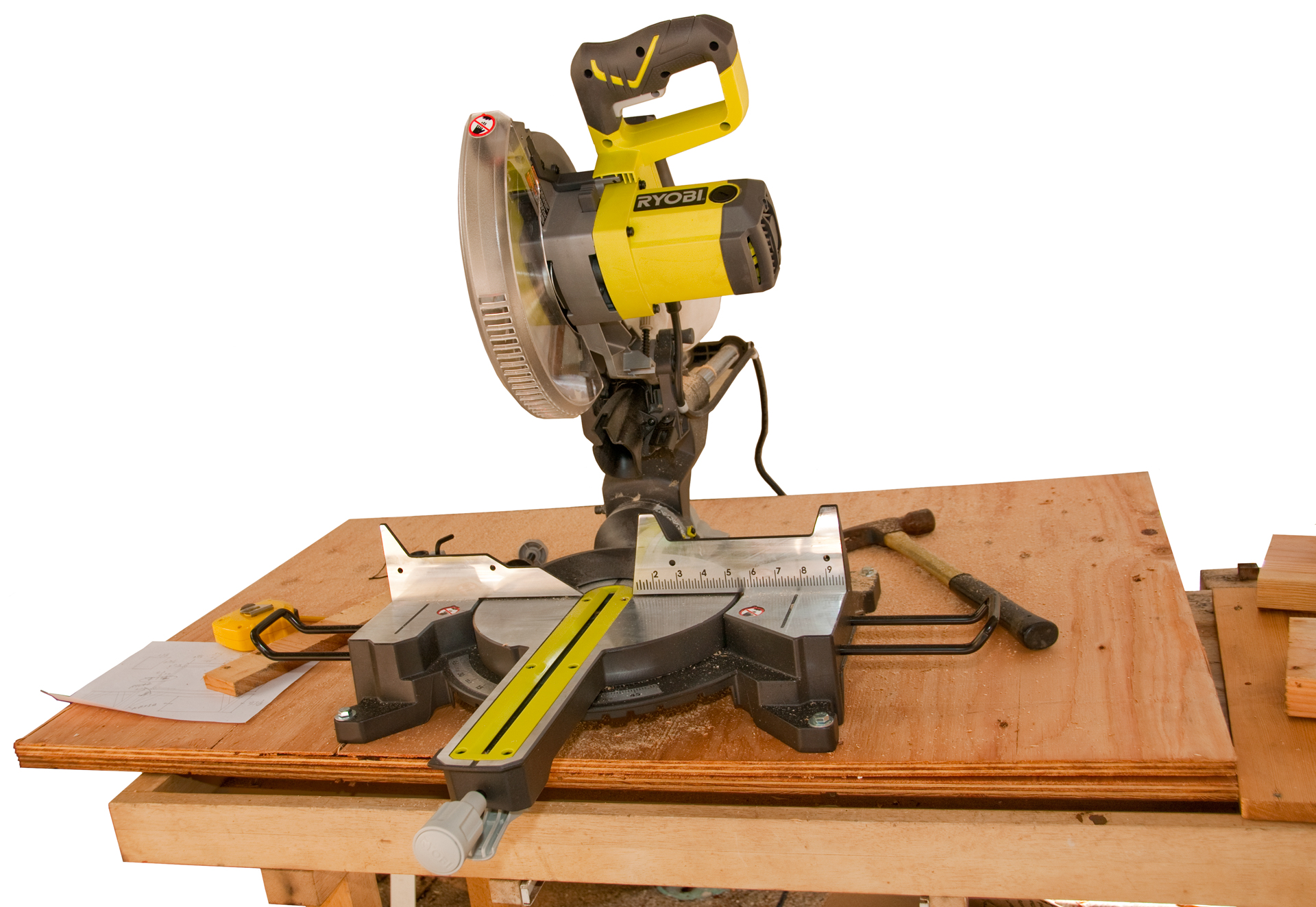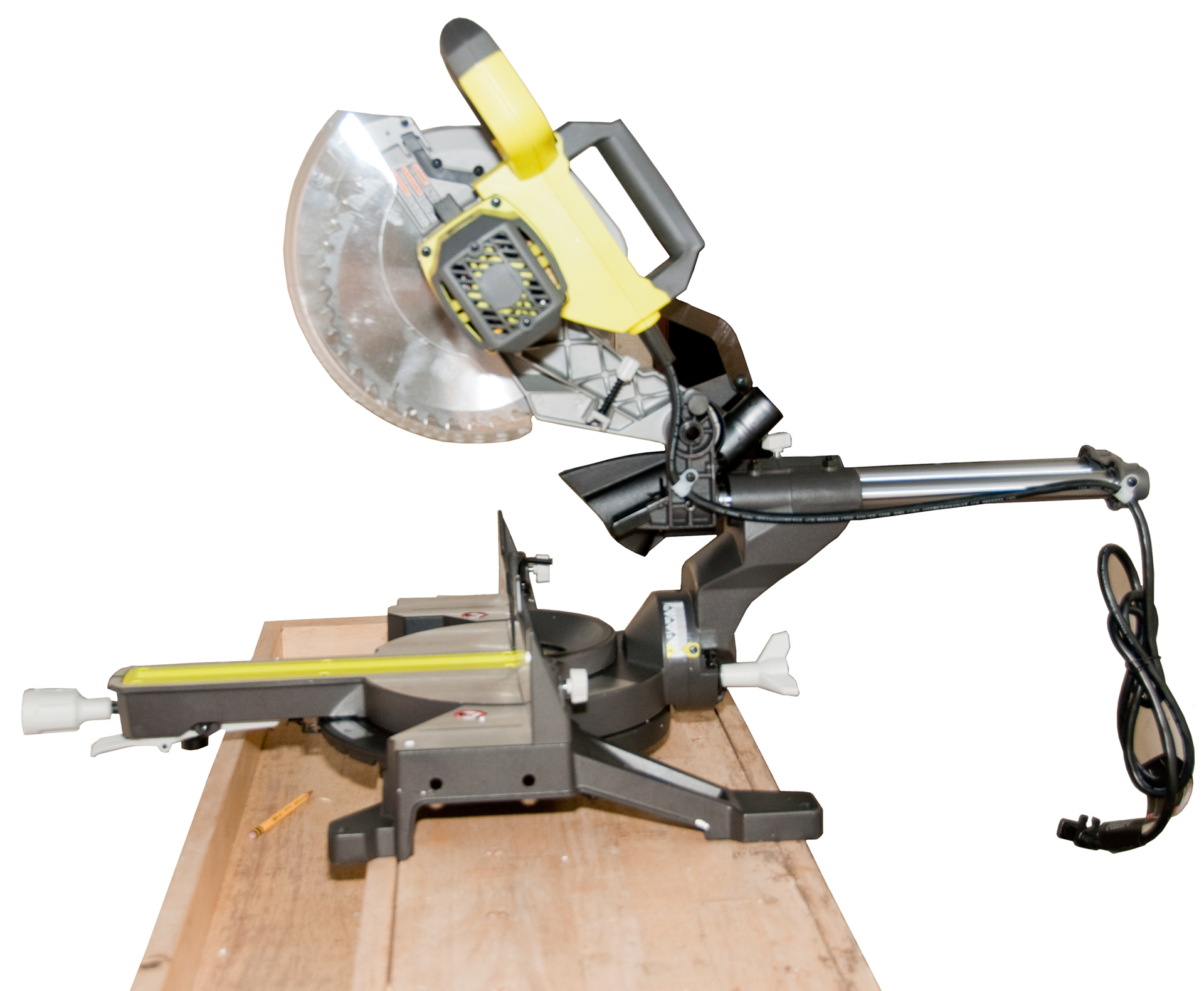 This is a Ryobi TSS102L Compound Sliding Miter Saw. Compound means that the saw can do a miter and/or bevel cut. Miter is when the blade is swung left or right and bevel means the blade is tilted left or right. Sliding means the saw can be pulled out and pushed back allowing a 2x12 to be cut. Without the sliding you could not cut a 2x12 using a 10" blade.