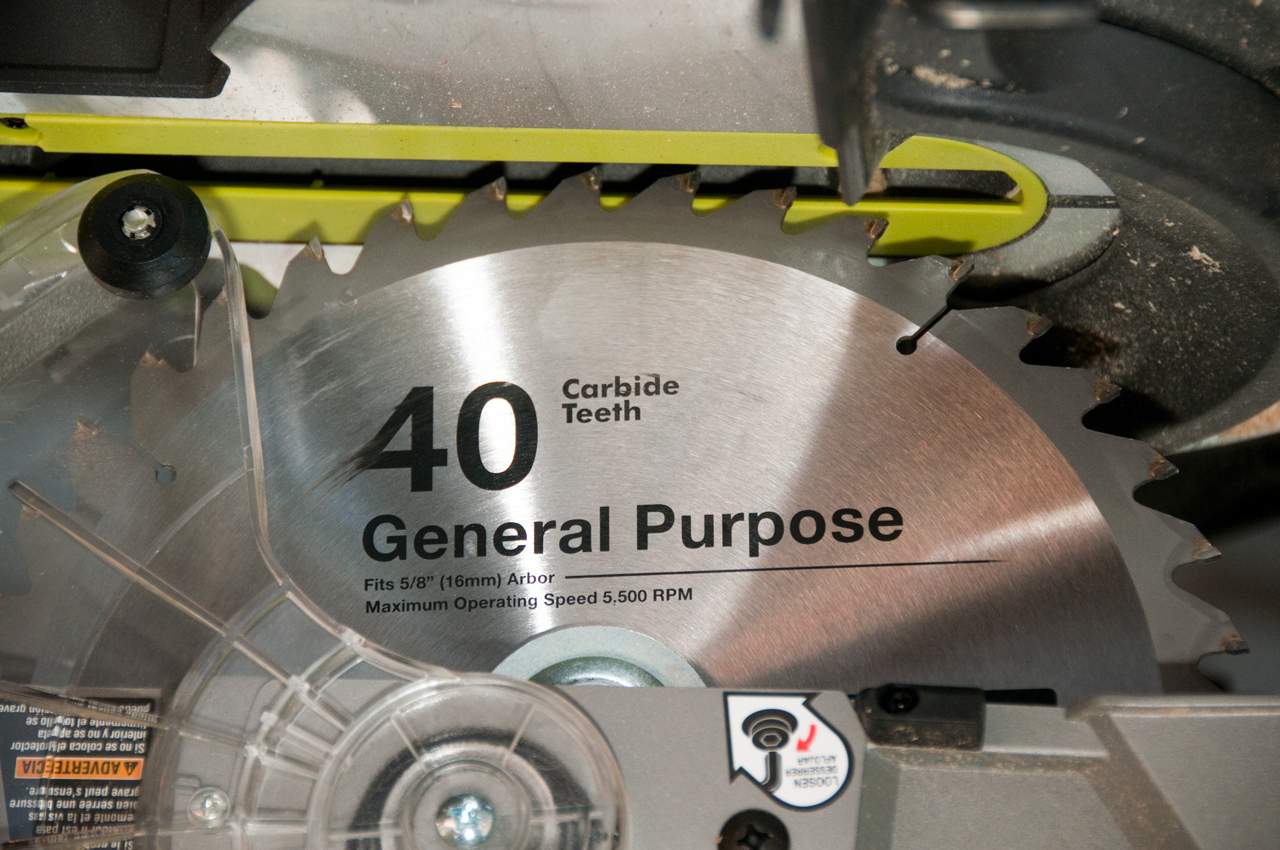 The 10"x5/8"-40T blade (Fig 15) that comes with the saw has 40 teeth. It's intended for general purpose use, like cutting 2 by framing lumber. But for precision cutting plywood, like for making bookcases a blade with more teeth makes for cuts with less splintering on the back side.