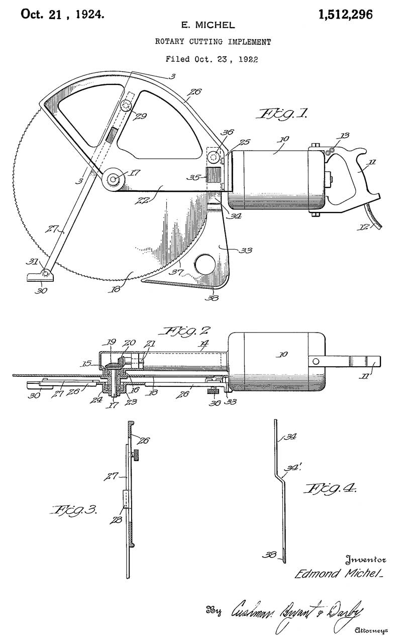 1512296 Rotary cutting implement, Michel, Edmond, Electric Hand Saw Co., 1924-10-21 - this one uses bevel gears (19 & 20). Edmond Michel invented the first electric powered hand operated saw (Wiki: Skil). But changing to a worm gear (Wiki). The worm gear can drive the conventional toothed gear, but the toothed gear can NOT drive the worm gear (Wiki).