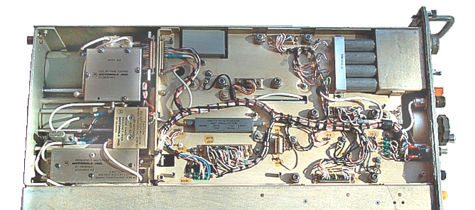 This is a 5" high rack mount Military UHF radio receiver made by Motorola for the Air Force. All connections are on the front panel. The 19 pin connector is labeled 120/208 Volts, 400 CPS, 3 Phase 4 wire. My plan was to replace the 400 Hz supply with a 60 Hz Power Supply brick which would fit in the right rear empty space behind the three synthesizer modules. Never did make the conversion.The synthesized tuning covers from 220.00 to 399.95 MHz. In addition there is a triple cavity preselector that is tuned by the manual geared tuning knob whose dial is calibrated with 5 MHz ticks. This receiver was designed to work with a transmitter very close by. Solid state construction using mostly discrete components (the golden age of surplus) should make it repairable.