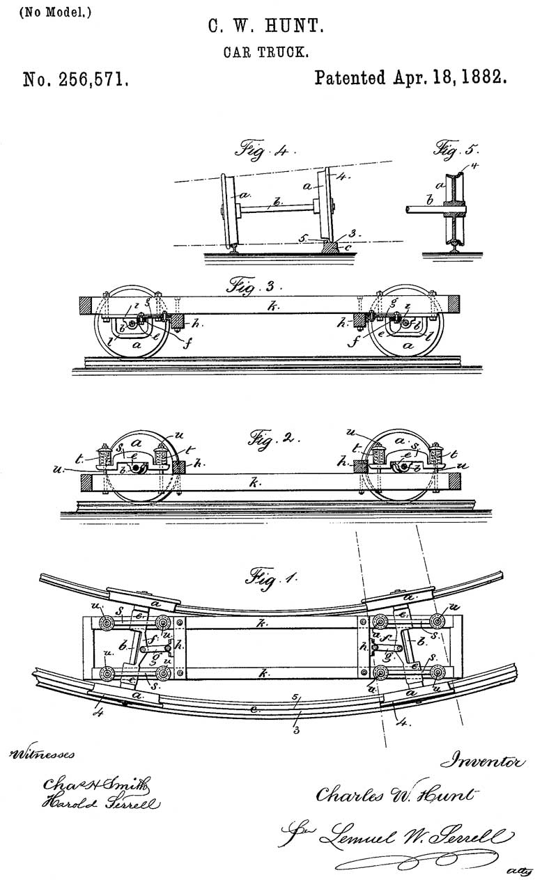 256571 Car Truck, C.W. Hunt, Apr 18, 1882, - "conical rolling-surface" BUT uses the flange/groove to keep on track. Does NOT understand what keeps trucks on the track.