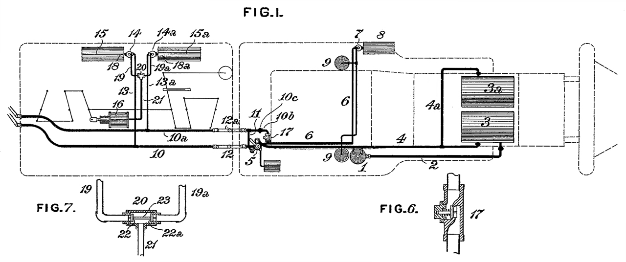 These air brakes stop the train when air pressure is applied from the engine. If the brakes are engaged and a coupling breaks, like when a car goes off the tracks, then the valve in the coupling closes so that the cars still on the track have braking air pressure.609484 Fluid-Pressure Automatic Brake, George Westinghouse, Aug 23, 1898, B60T17/18 - dual system with pressure tanks on each car and two hoses between cars.