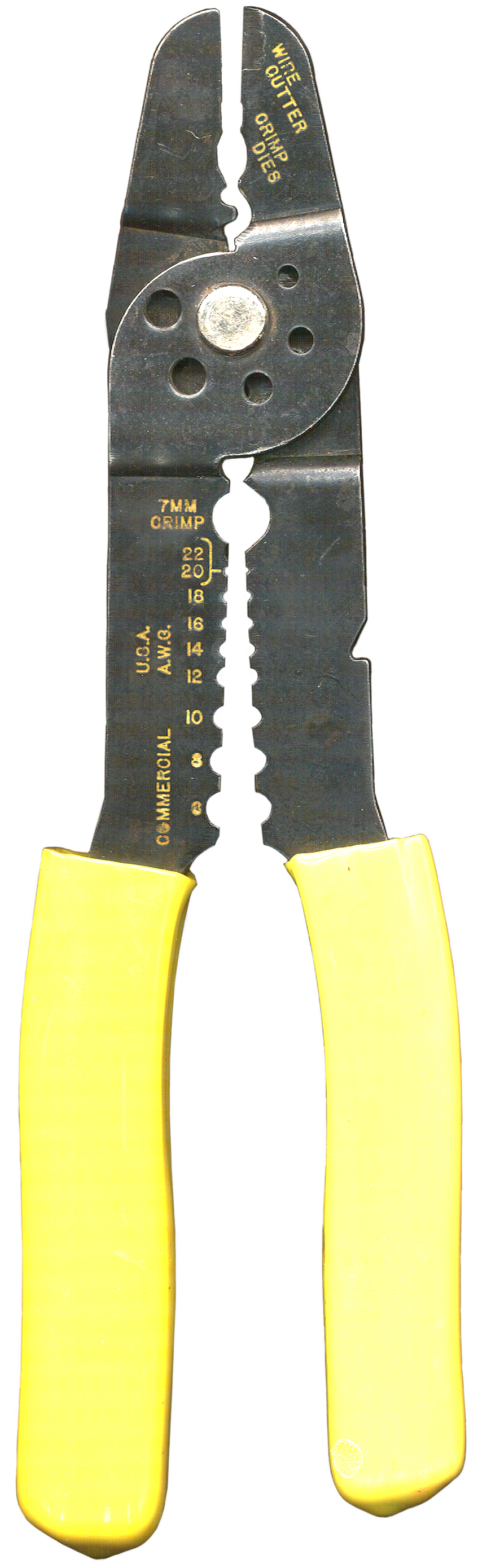 3 Dec 2007 - looking at the photos of the crimping done in the last couple of days shows what may be nicks of strands. Will need to use a microscope to confirm. It that's the case then this tool will become mandatory for stripping.You can use a All-In-One pliers (shown at left) type wire stripper, crimping tool to capture the wire and/or solder the wire. It may be that if the wire used is small compared to the inside diameter of the terminal that crimping will flatten the terminal and make it too wide to fit into the housing.