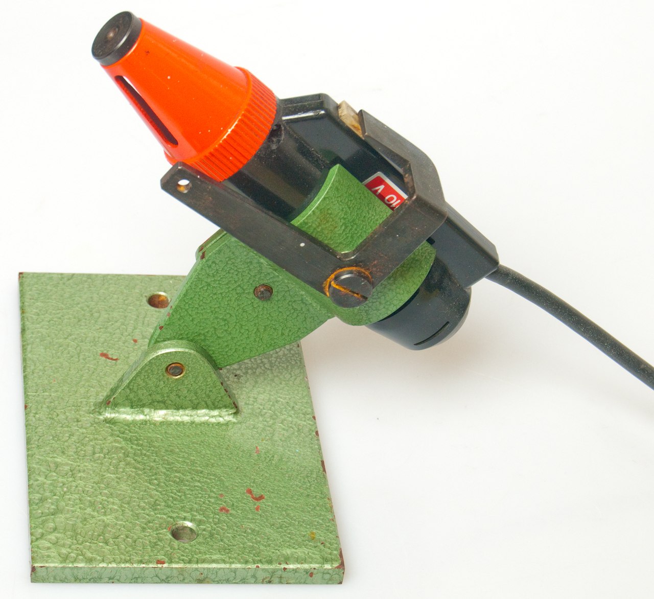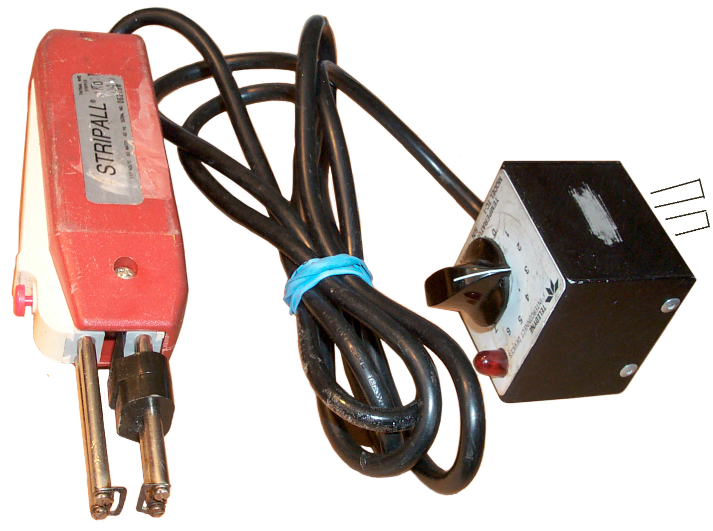 This stripper is AC line powered (and has been converted to 110 VAC from 220 VAC). It's specifically designed for stripping magnet wire. It came as a used unit with a stand including mechanical remote On button press lever (with hold to make a floor mounted mechanical switch). Also included are an Allen wrench and pin spanner for adjusting the wire size.